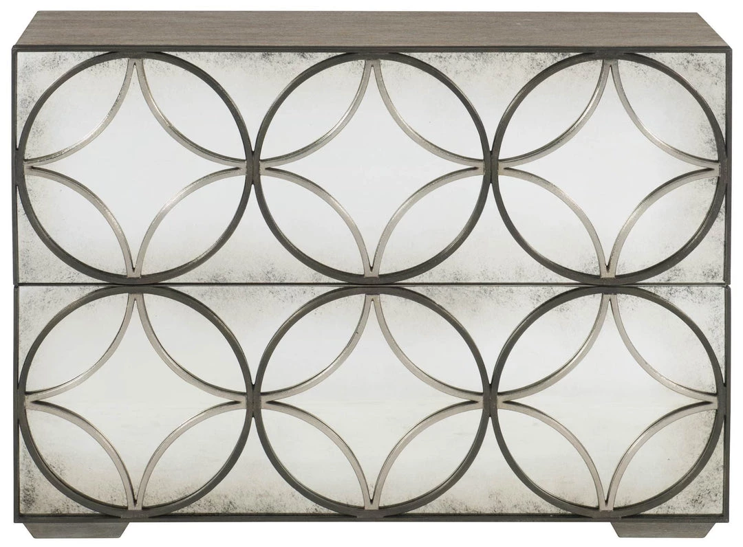 - Two touch-to-open drawers with antiqued mirrored glass drawer fronts