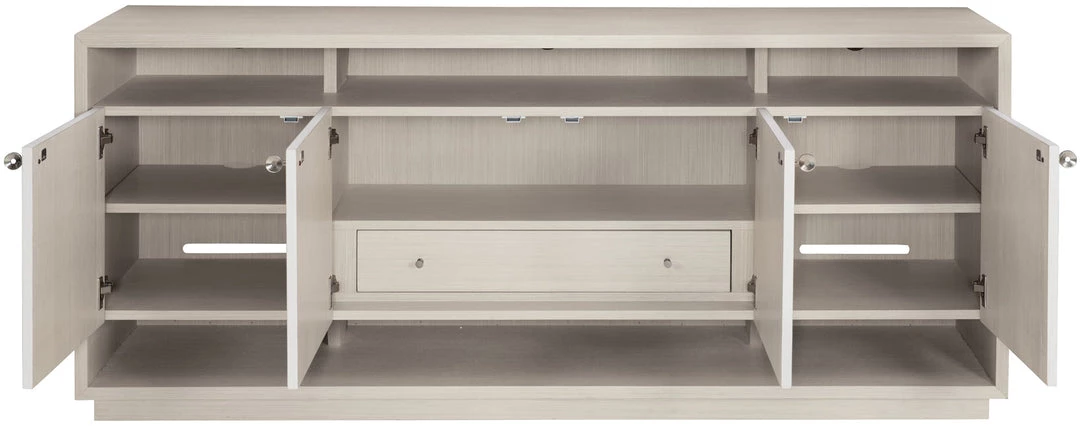 - Behind center paired doors is an open compartment and one drawer with wrapped pad