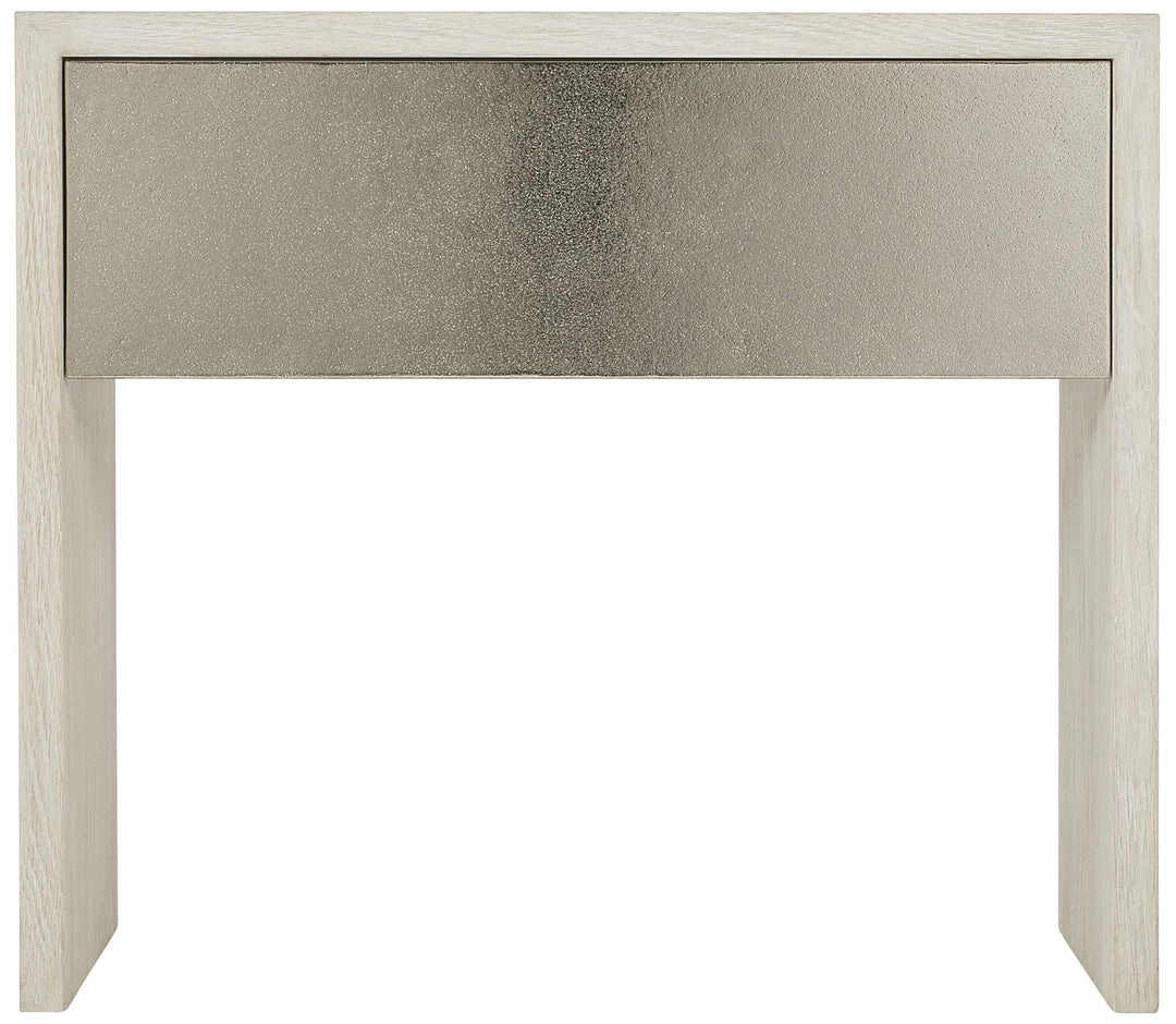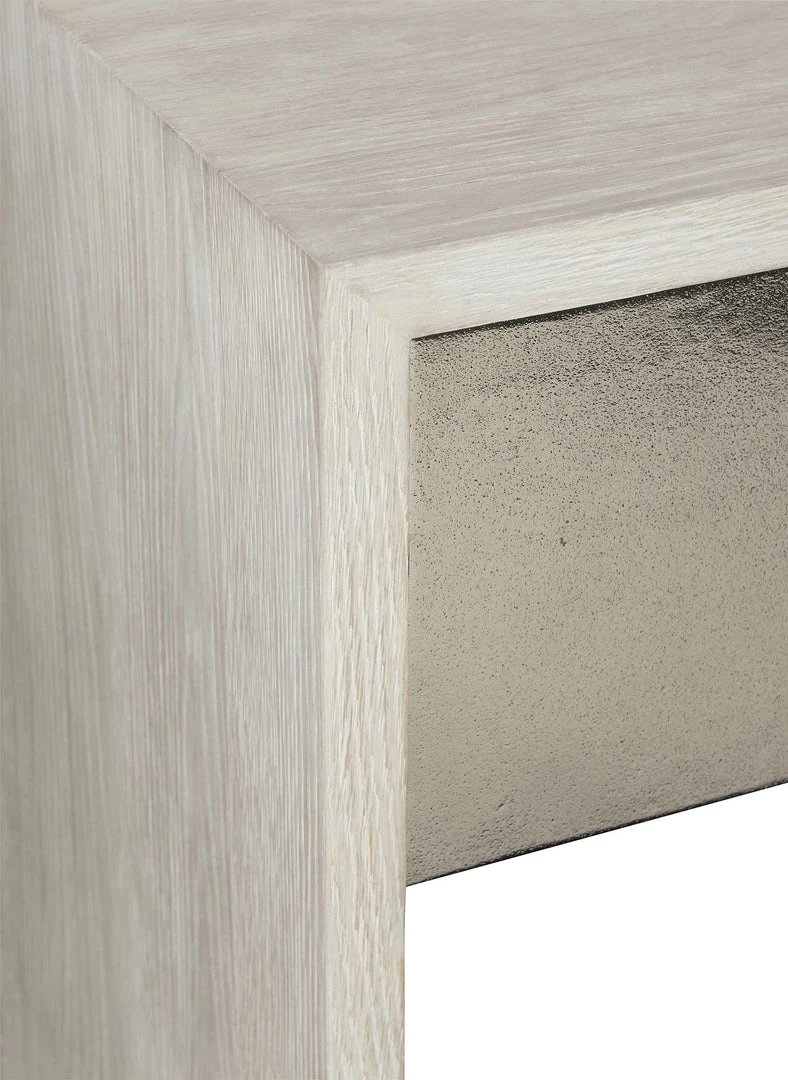 - One push-to-open drawer with inset front panel of cast aluminum in shiny nickel finish
