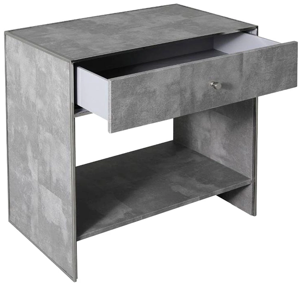 - Inset Gray faux vellum panels on top, ends and drawer fronts