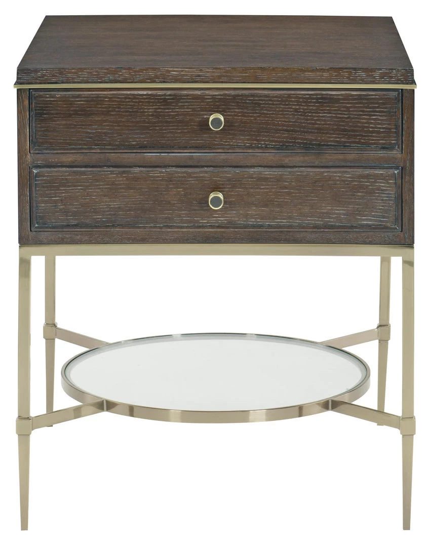 - Stainless steel base in Burnished Brass finish with inset round tempered glass shelf