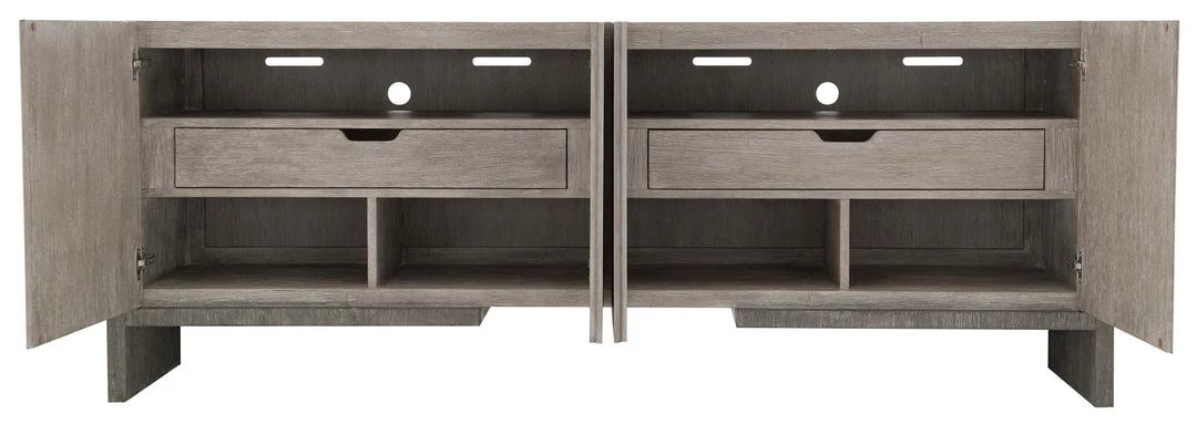 - Behind each pair of doors is an open compartment with ventilation holes and one grommet hole with cover