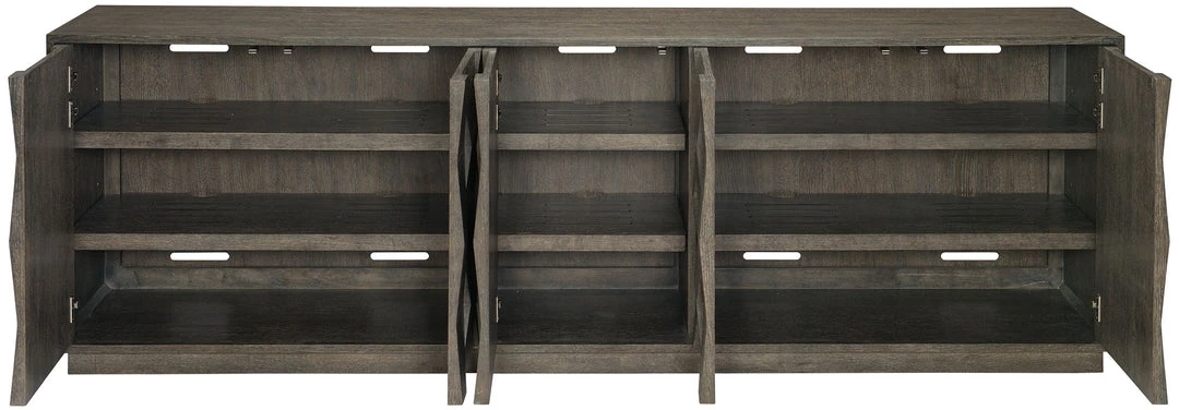 - Behind each paired end doors and center door are two adjustable/removable, vented shelves with ventilation holes and grommet holes with covers in back panel for wire management