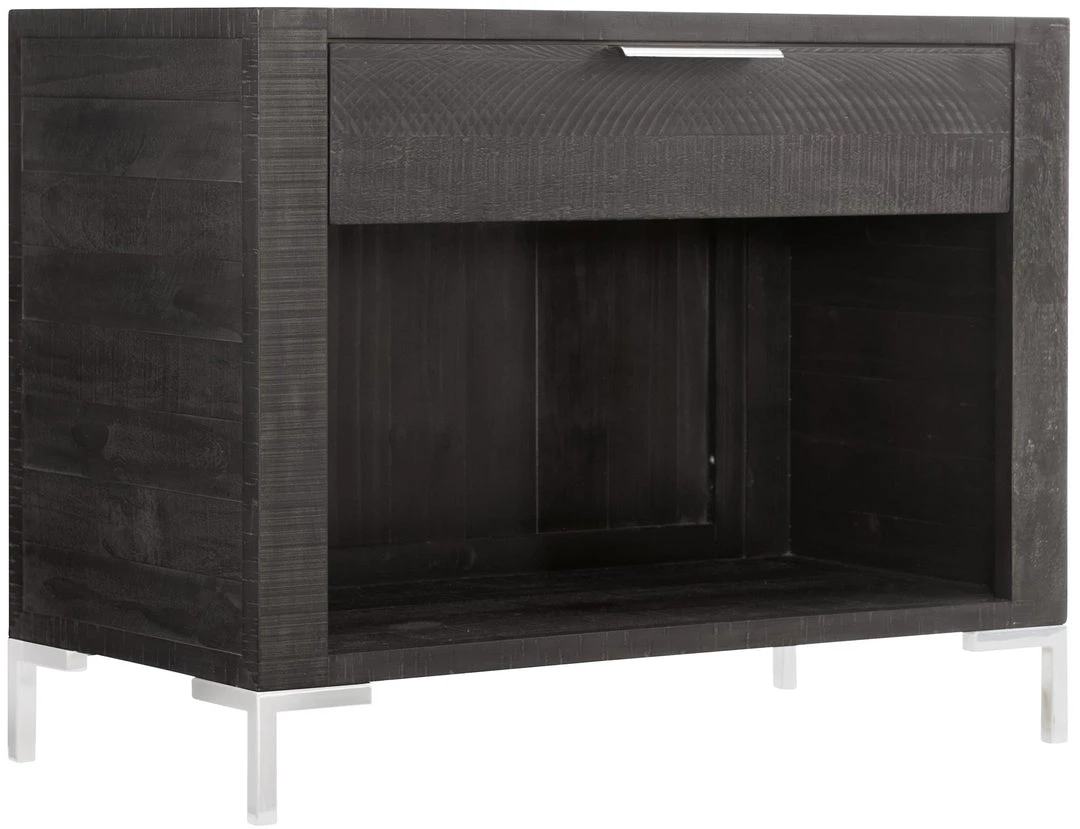 - Below drawer is an open front compartment with bottom shelf surface