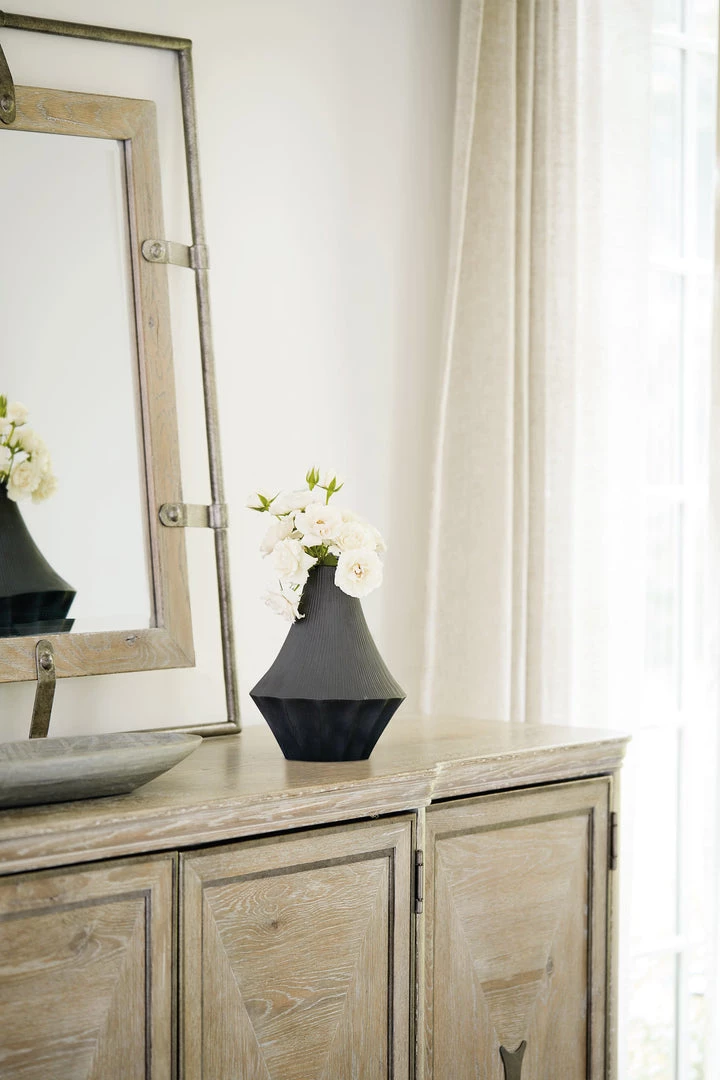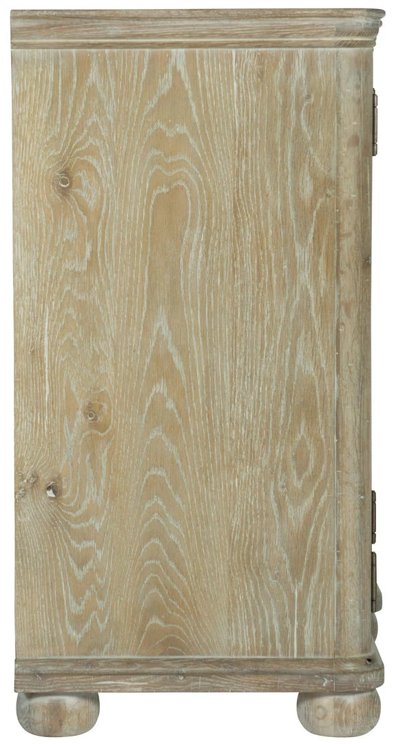 - Behind paired center doors is one fixed top shelf, one drawer with hand cut-out with silverware insert