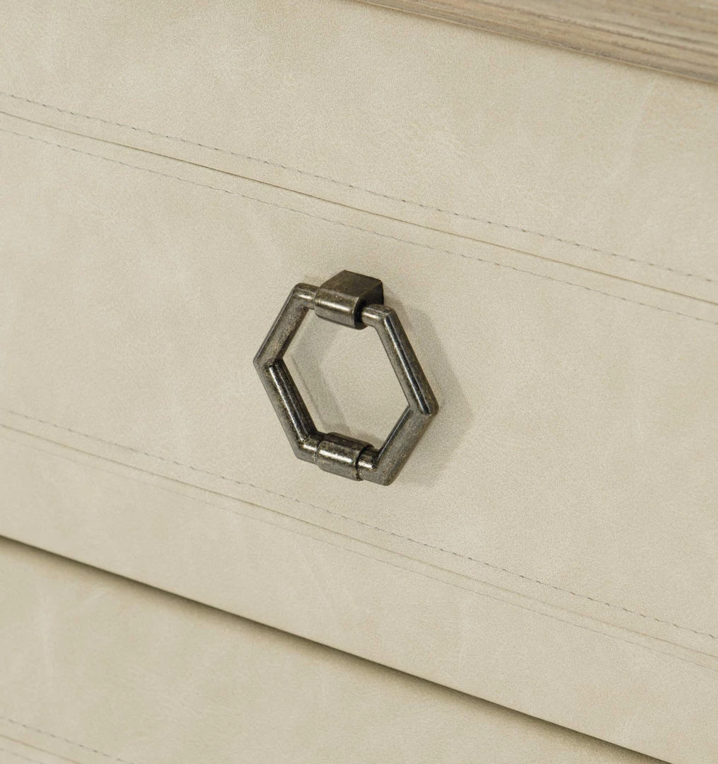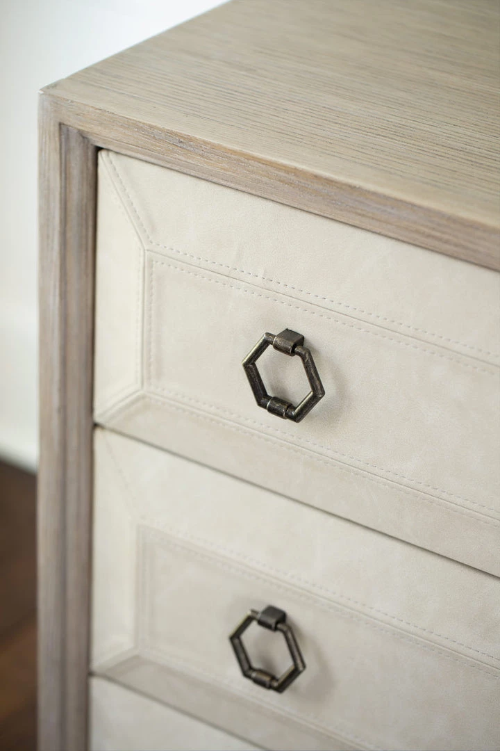 - Three drawers with raised drawer fronts wrapped in performance fabric with double-needle stitching