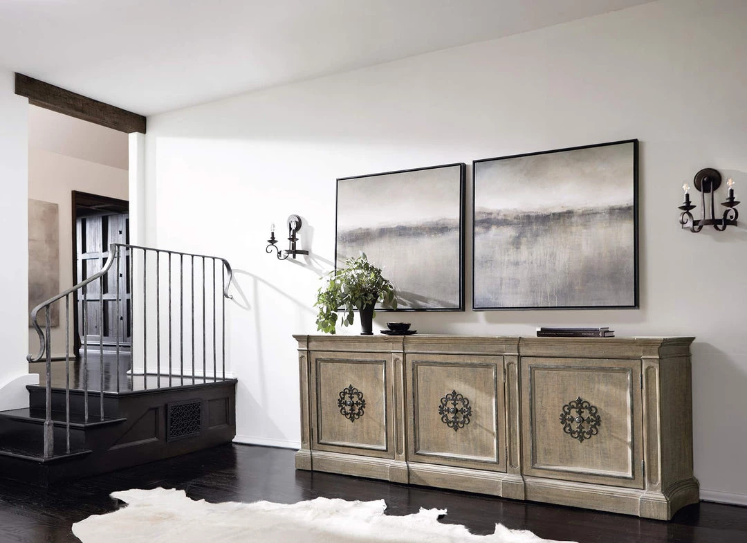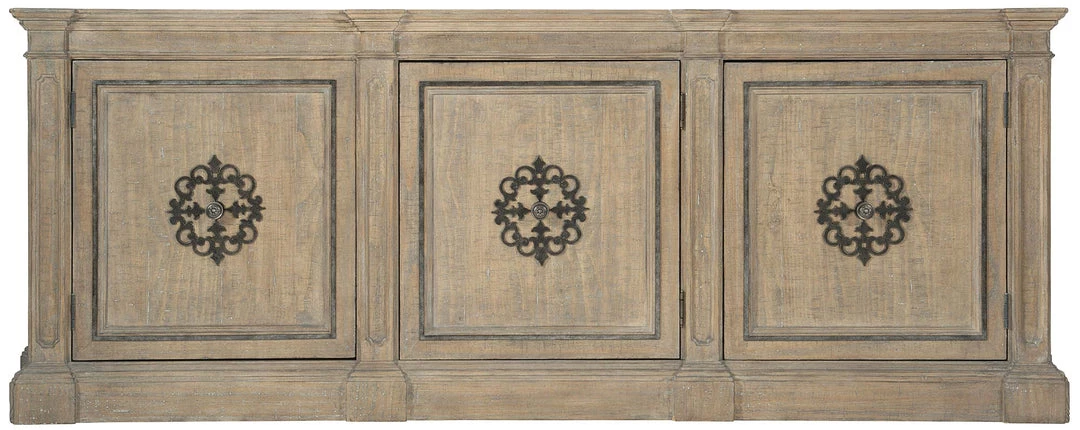 - Behind center door is one fixed shelf, one drawer with wrapped pad and hand cut-out, ventilation holes, two grommet holes with cover in back panel and fixed bottom shelf surface