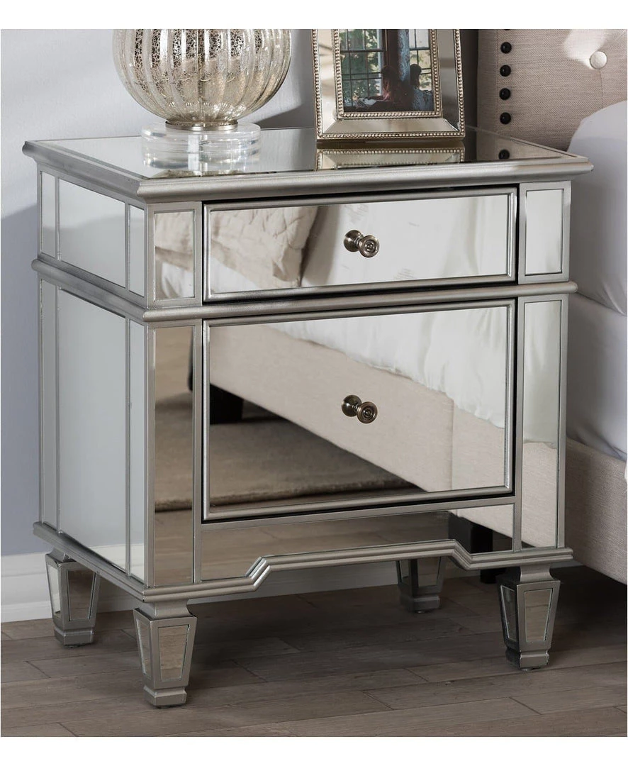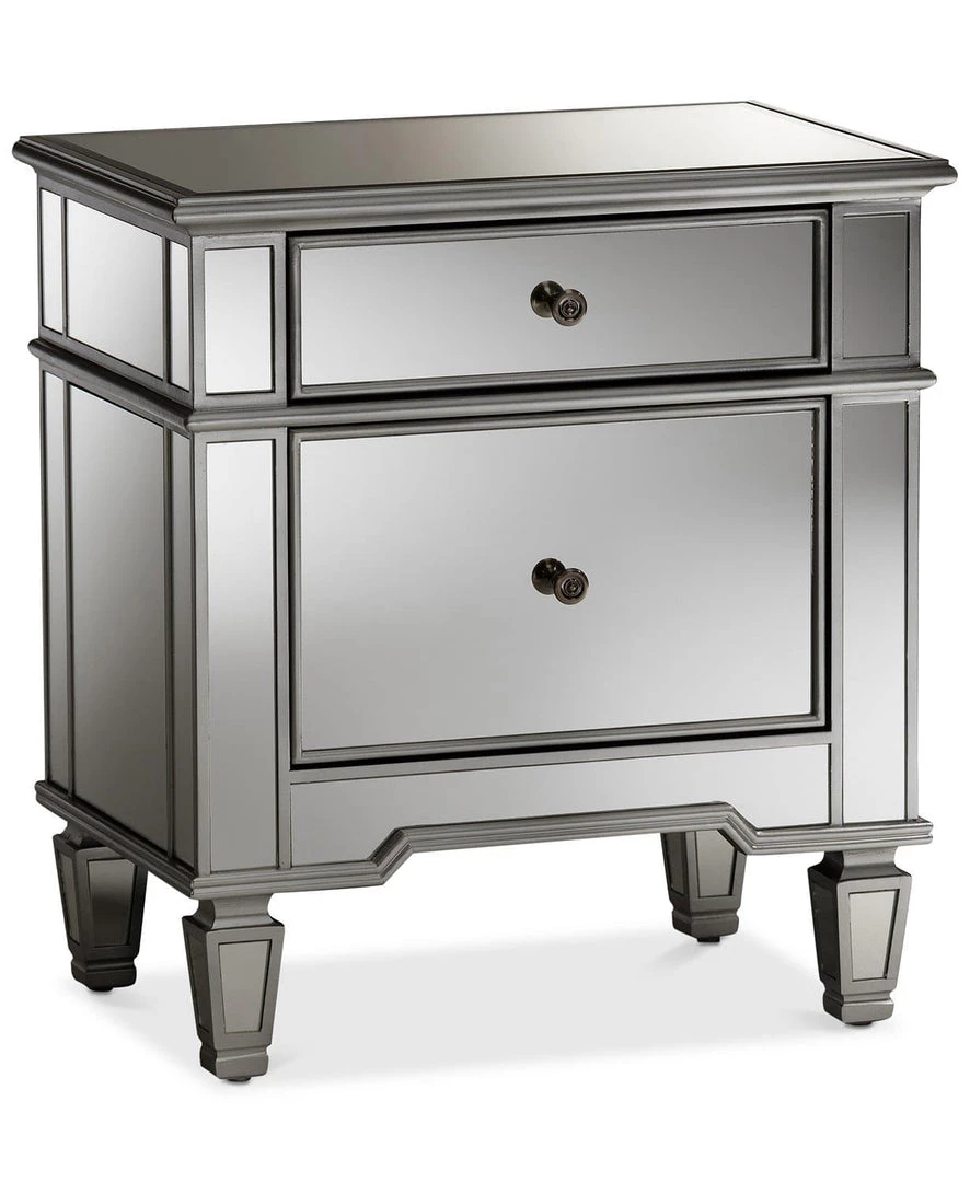 Give your bedroom or living room a more glamorous look with this glimmering nightstand. This stand features a 2 drawers that’ll provide plenty of storage space, arrow legs, a mirrored top, and a brush of silver color that’ll create an elegant look. It can be used as a side nightstand next to your bed or an end table in your living room.