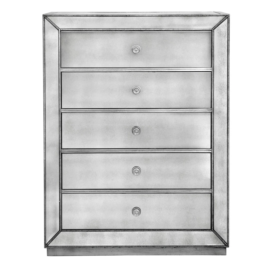 Our Mirrored 5 Drawer Chest demonstrates a striking use of style and restraint. While elegantly reflecting its surroundings this functional collection combines glamour with purpose. The clean lines of the cases are outlined in a hand- applied silver leaf and silver beaded trim while the drawers are accented with a brushed silver hardware.