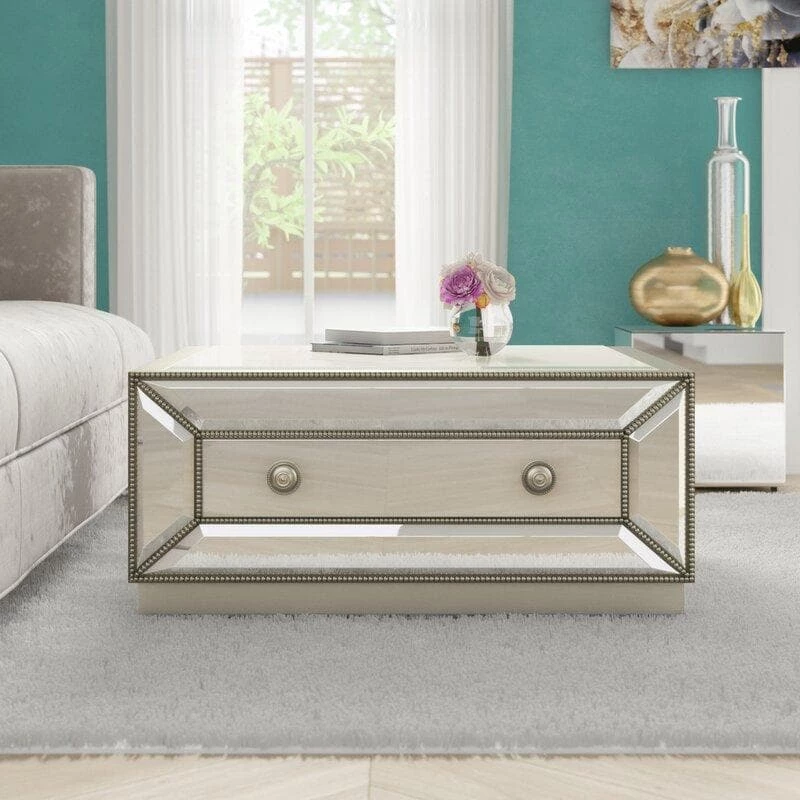 This special silver mirrored table will bring out the contemporary look you want for your living room. Made of solid wood and antique mirrored panels with a distressed look. It will look beautiful with a soft white rug with a brown wooden floors. Proudly display this table in your living room and your friends and guest will defiantly be surprised over this beautiful style.