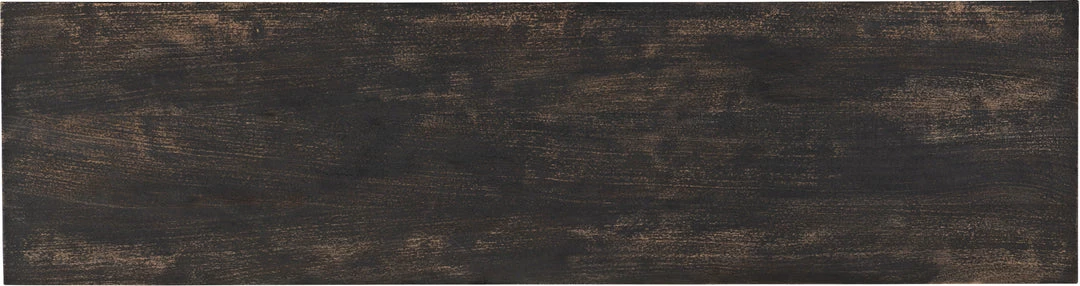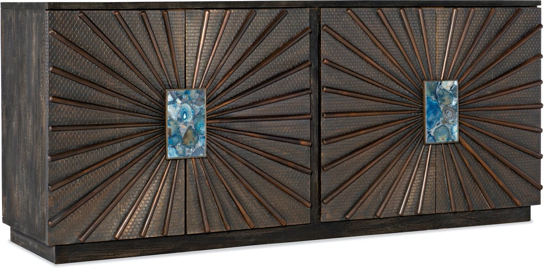 A bold and artistic marriage of Mango Wood, brass and agate stone, the Tara Credenza has a honeycomb-pattern metal overlay and an antique bronze colored starburst on the doors. The case is finished in a black with rub-through, and the dramatic hardware has a turquoise and brown agate center and metal frame. One adjustable shelf behind each door. Come closer to Melange, and you will discover something unexpected, an eclectic blending of colors, textures and materials in a vibrant collection of one-of-a-kind artistic pieces.