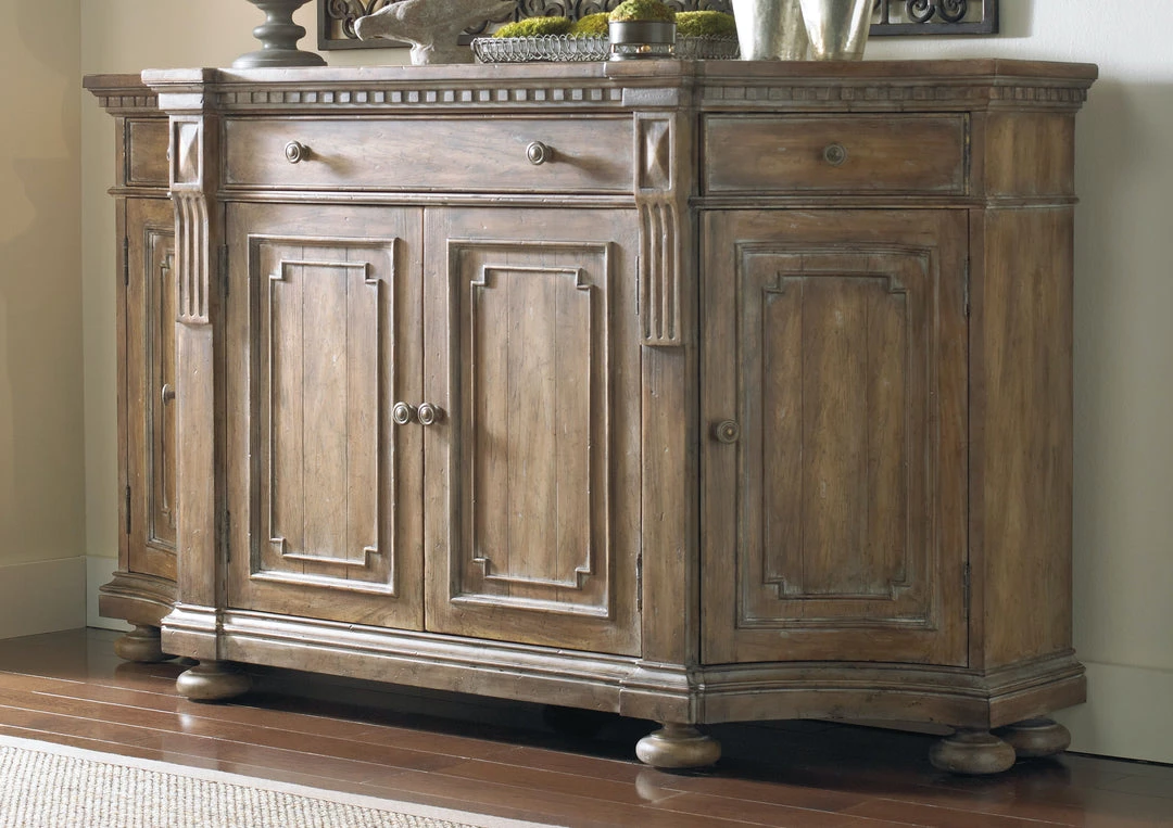 Timeless design details like dentil molding and column motifs combine with an updated taupe-colored antique finish with a light washed white undertone to create a focal point that’s a contemporary classic. Packed with storage, the Sorella Credenza has a center drop-front drawer, 2 side swing-out drawers, one adjustable shelf behind each of the 2 side doors and one adjustable shelf behind the 2 center doors. Featuring wire management, the credenza is a multi-functional piece that can be used in the dining room, as a home entertainment piece or even in a work space. There are many comfortable ways to spend quality time with family and friends. We invite you to make our Sorella collection part of your home. When you add their ingredients of style, grace and comfort you are in for a true experience.