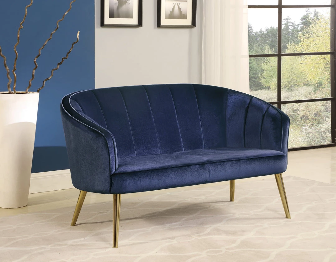 This plush, cozy settee is the ideal place to curl up with a partner and watch your favorite show. The thick deluxe cushions and back hit all the right cozy notes for comfort and function. Yet, the chair also has stylish channeling details that make it stand out amongst any decor. Enhancing the charm factor is the gorgeous brass finish on the four angled legs. So, grab your favorite warm throw and enjoy the creature comforts that this velvet settee has to offer.