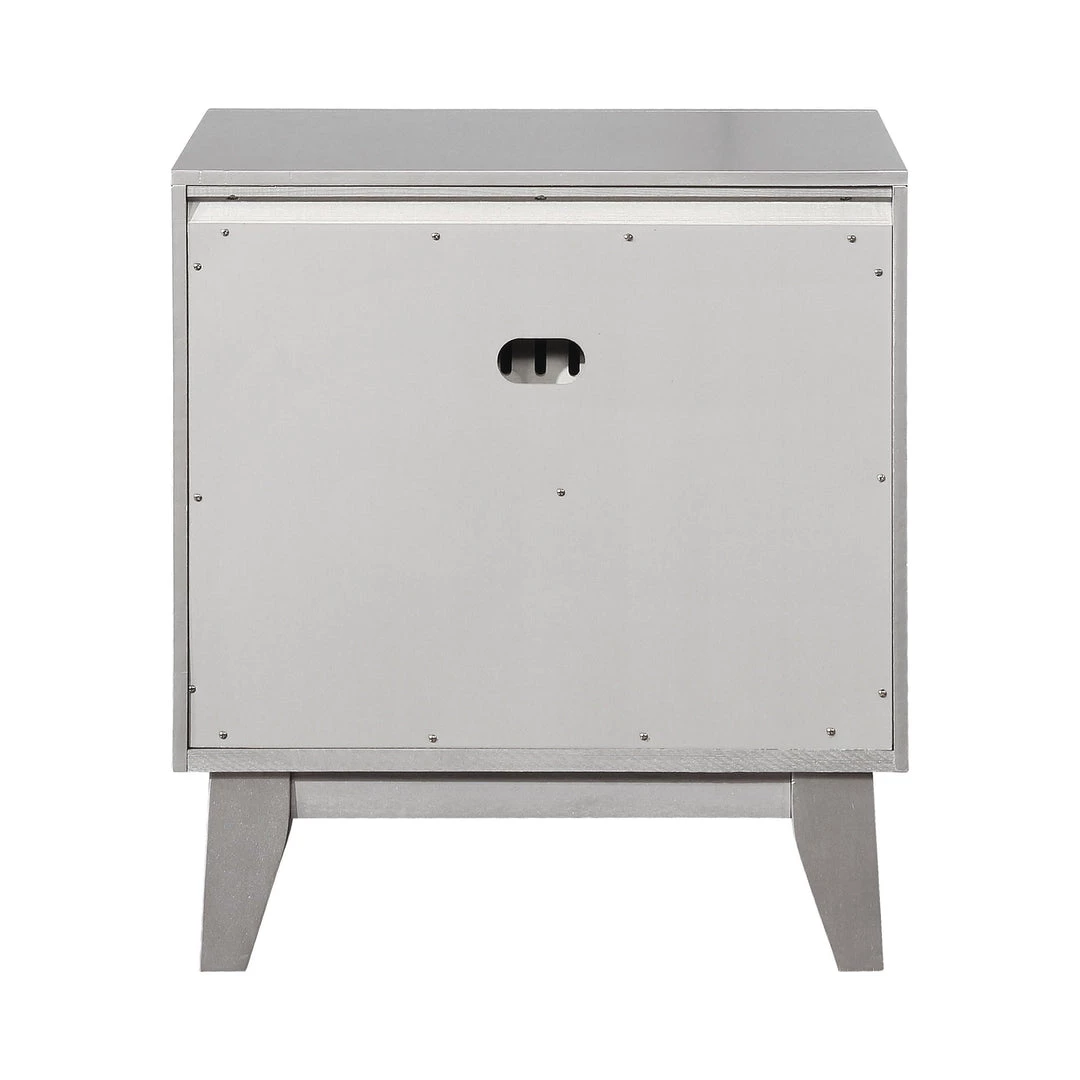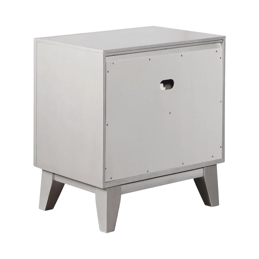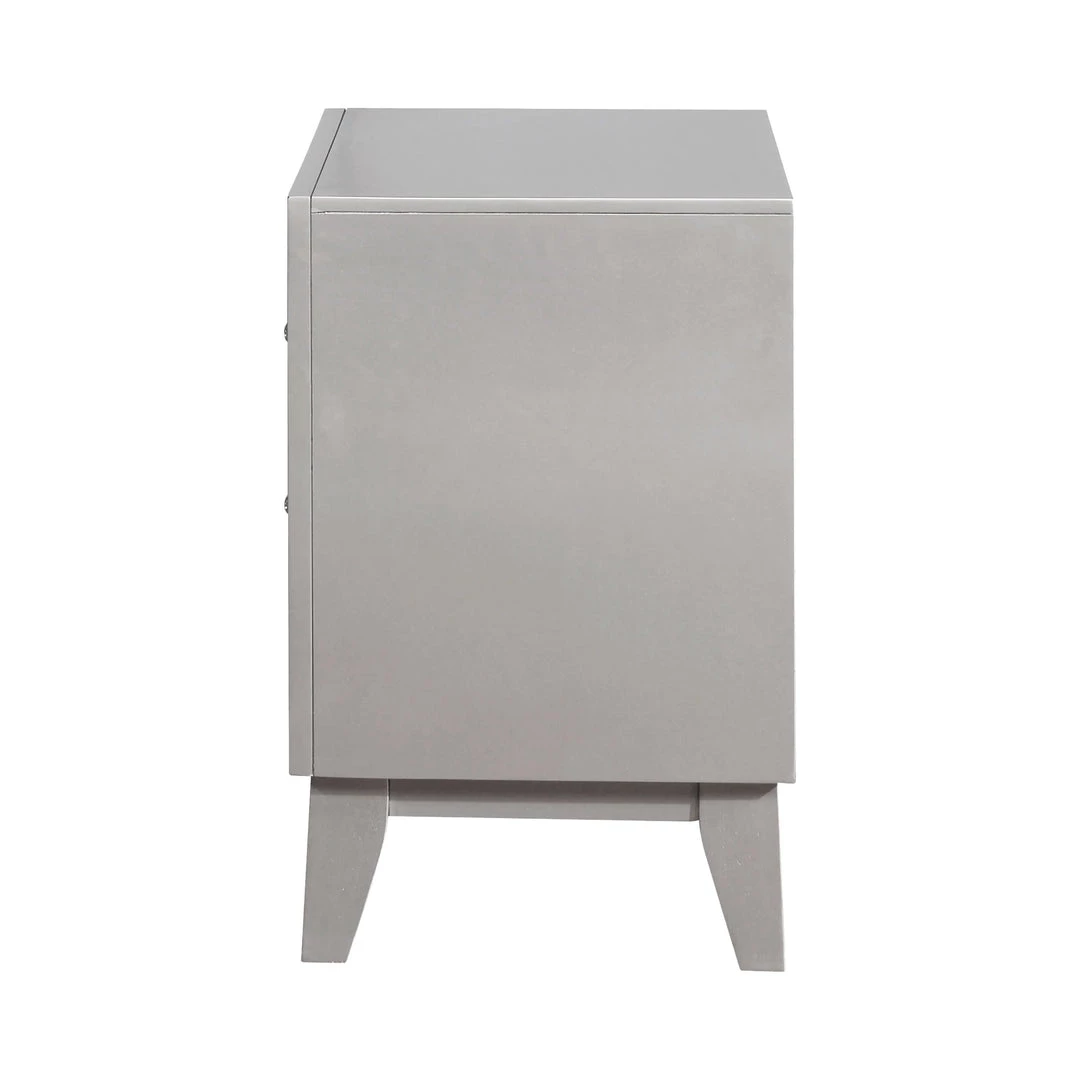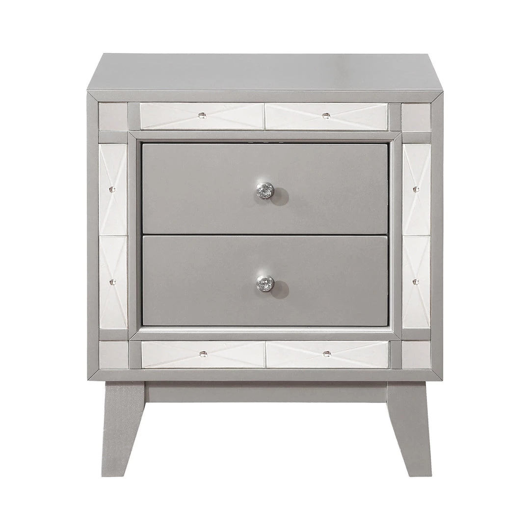 Glamorous and streamlined, this transitional two-drawer nightstand is full of chic details. Great for a stylish bedroom, the sleek silhouette features retro-inspired tapered and angled legs. Full of shine, the drawers feature etched mirror panels that accent the frame work. A radiant metallic mercury finish opens up spaces with glam. Decorate with a mirrored vase or jewelry box for a full-on fashionable look.