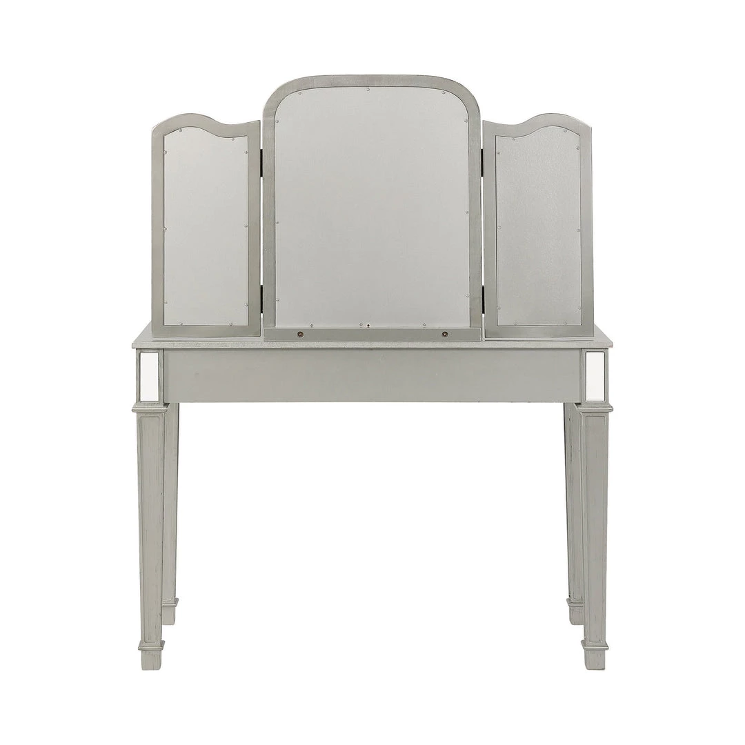 Perfect for the budding fashionista, this three piece vanity set reflects with radiance. Featuring a metallic finish, the wooden frame is adorned with shiny mirror pieces. The classic vanity mirror gets an upgrade with a sleek frame on the traditional curved silhouette. Complete with a drawer, the vanity desk features chic crystal hardware. Soft and glamorous, the seat is topped off with a plush cushion.