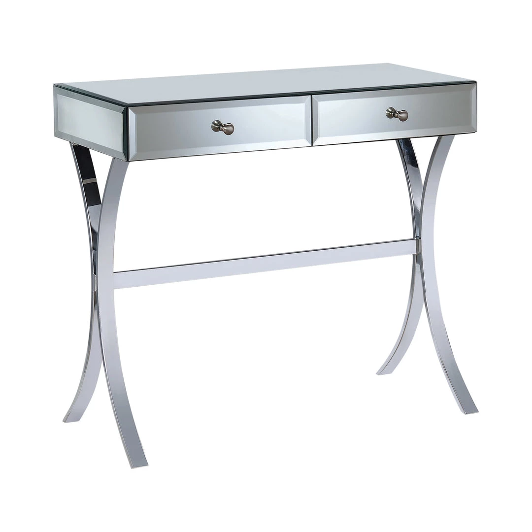 Add this console table to the home for an alluring brilliance and shine. It features two spacious drawers for convenient storage. Wide table top accommodates a decorative table lamp and knickknacks. It features gorgeous curved legs that add a touch of class. Table is beautifully covered in mirror panels with chrome-finished frame and legs for a modern look.