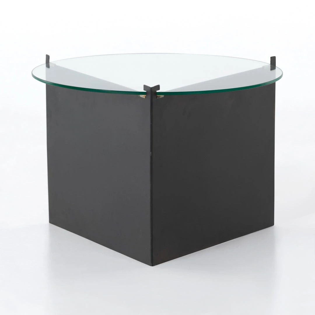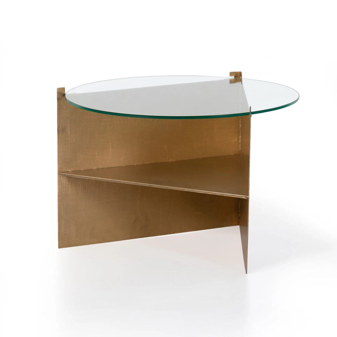 Go glam. A triangular two-tone iron base is folded into an artful pedestal then finished in a blackish charcoal, with a brushed gold interior for contrast. A single center shelf brings extra storage and display space to the living room, while a rounded glass tabletop keeps things looking light.