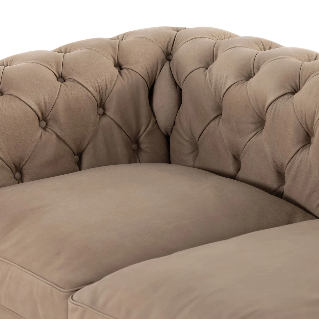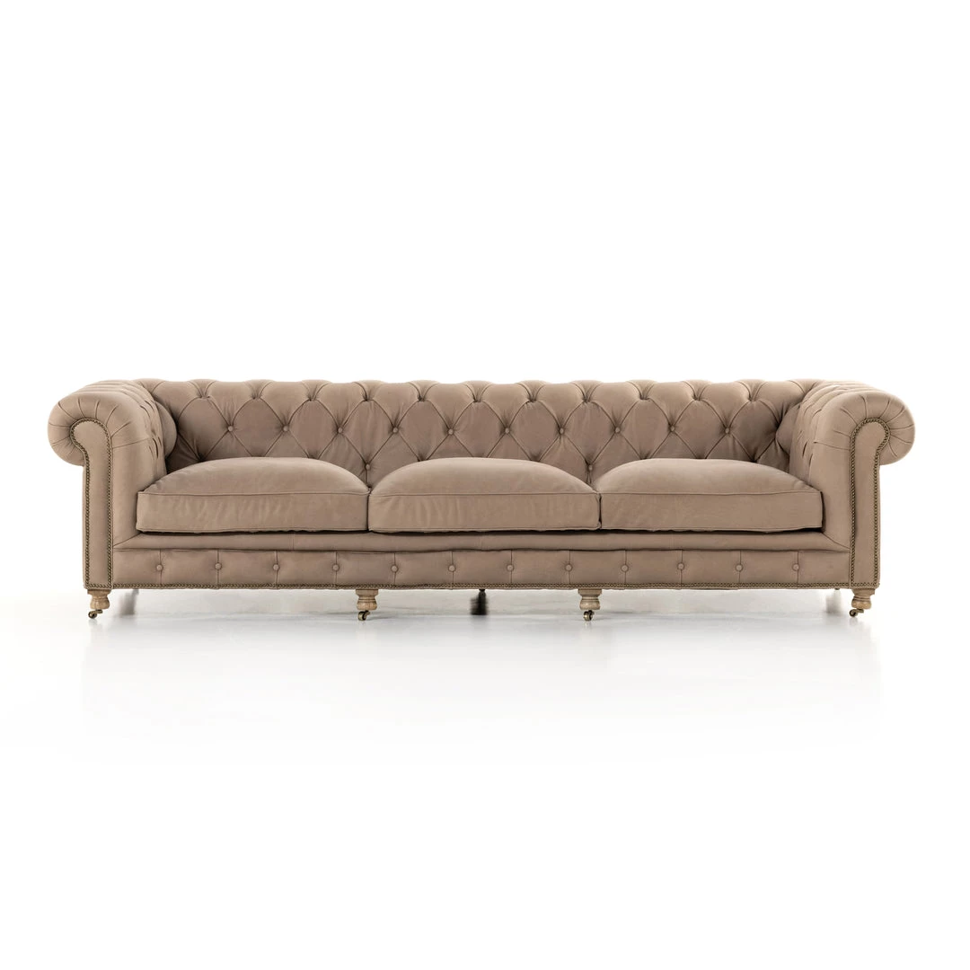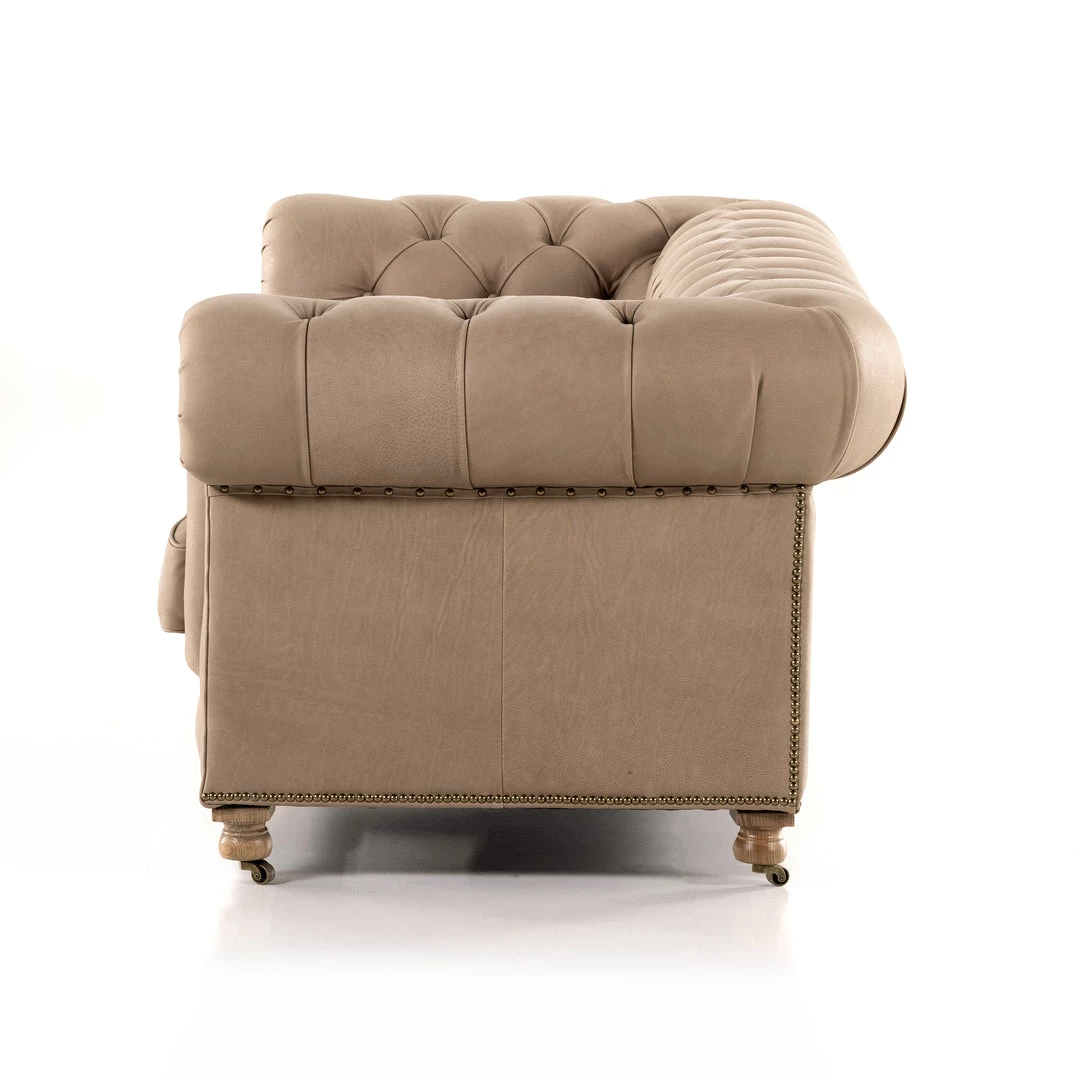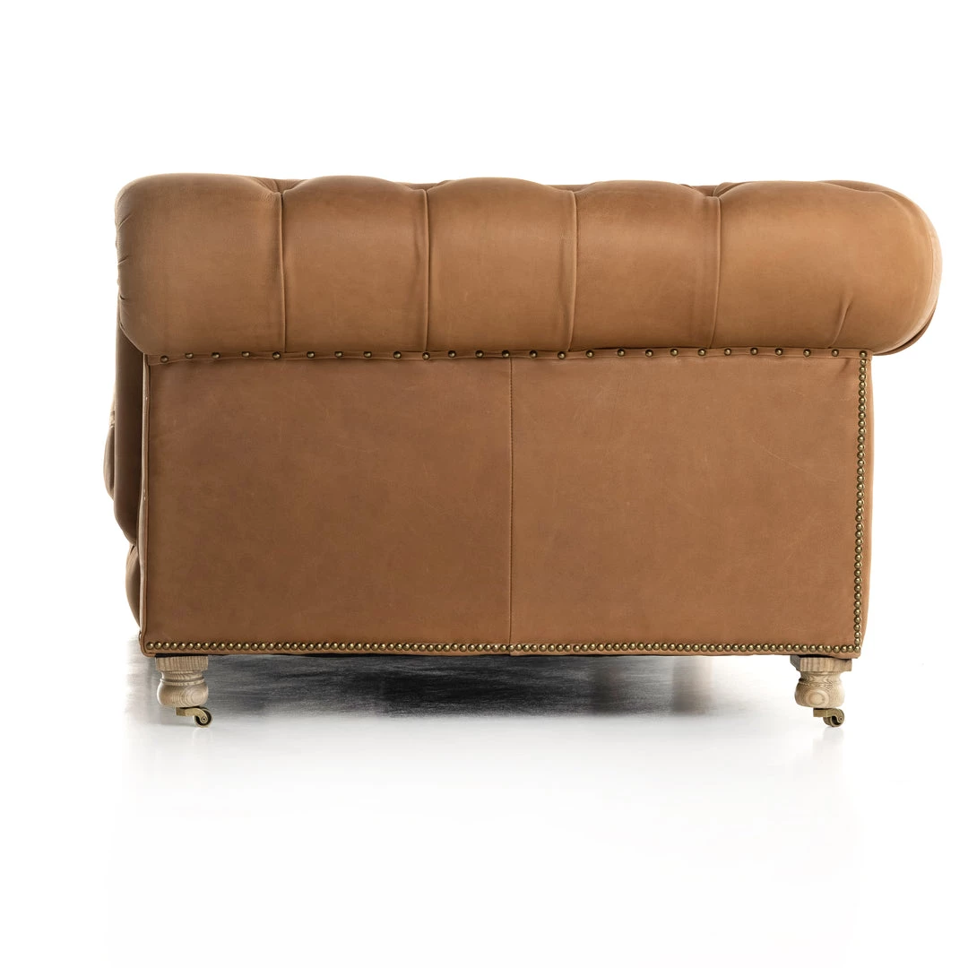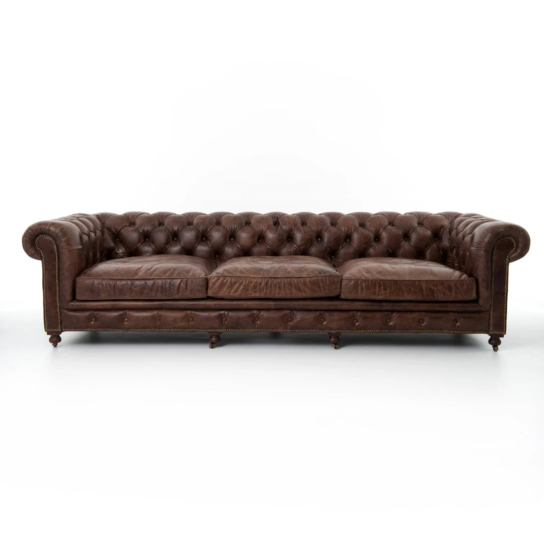 This dramatic Chesterfield sofa has a grand, men’s club feel. Saddle-toned, top-grain leather is lovingly aged — an effect that will intensify beautifully in time.