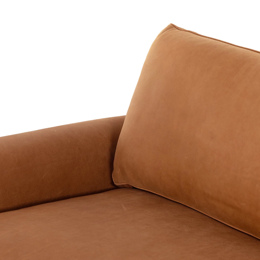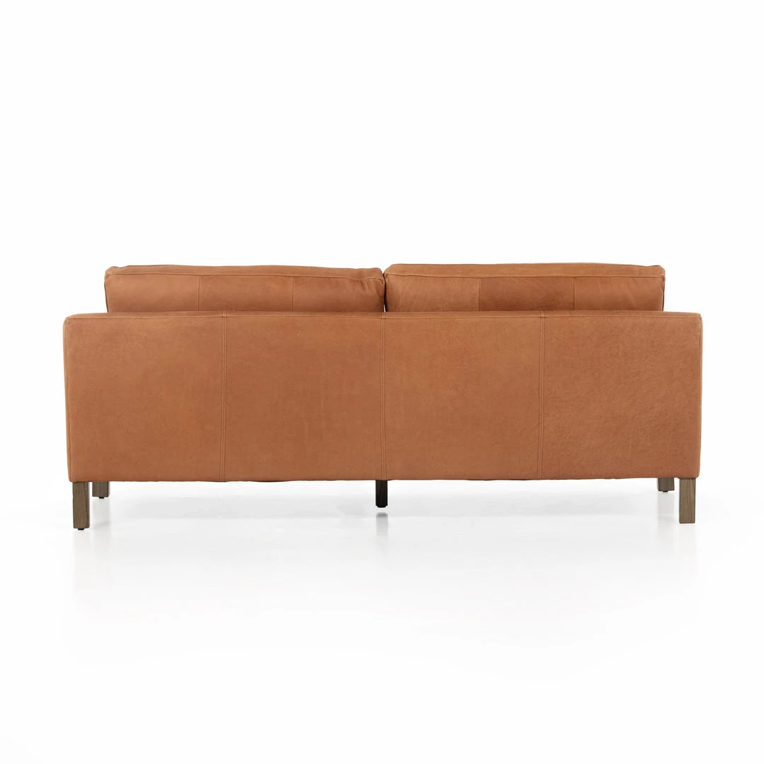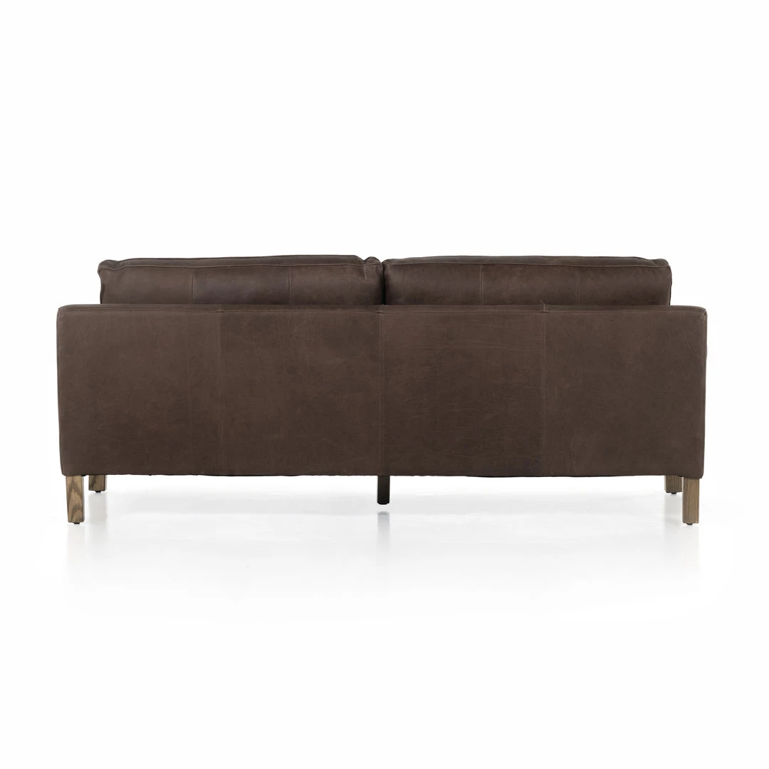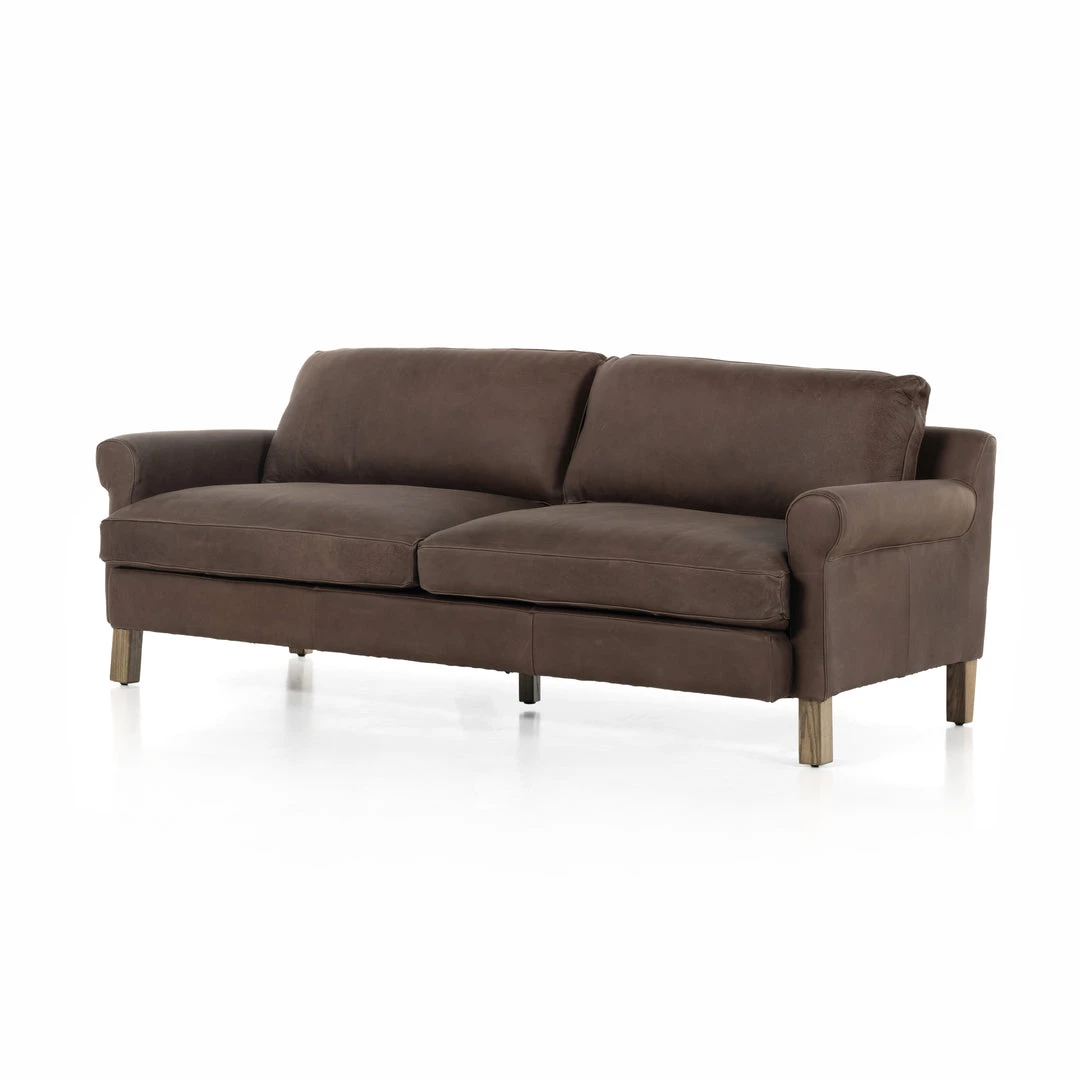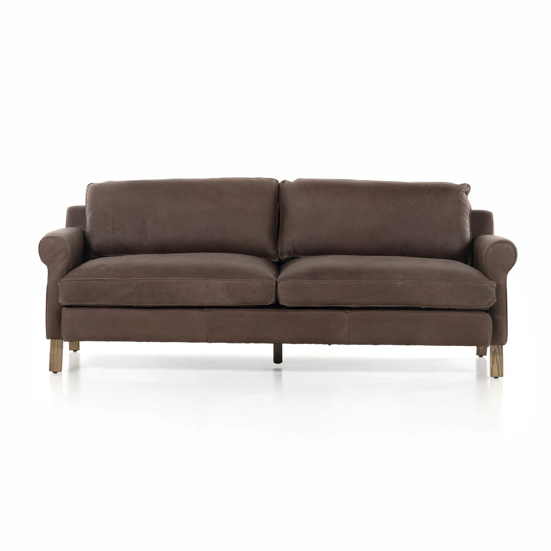 The traditional roll arm gets a modern refresh in this sink-right-in sofa made from cocoa-colored top-grain leather atop a solid ash base.
