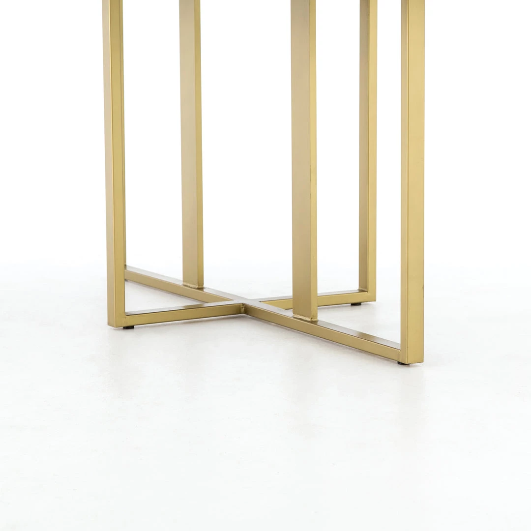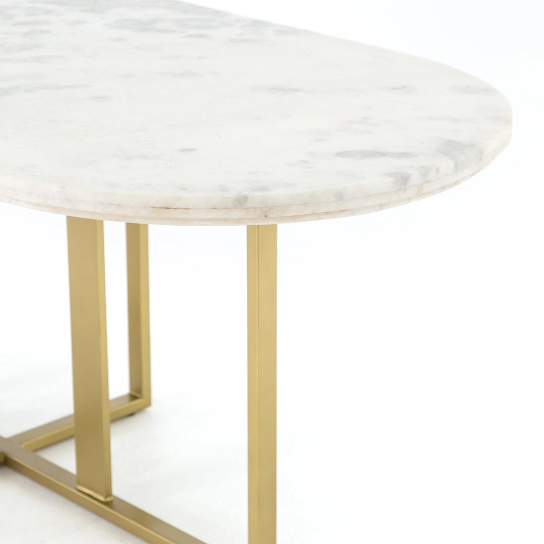 Unique oval shaping brings implied movement to the table. A brass-finished iron base forms clean, architectural angles to support a rounded top of white marble. A recessed apron adds a touch of depth to feminine-spirited design.