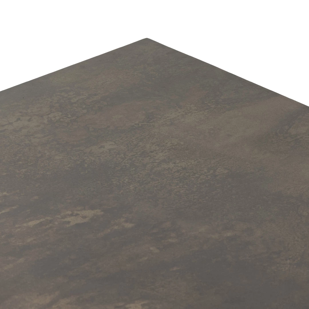 An organic-spirited statement piece. With thick, wide proportions, a dining table of distressed iron tops an intersecting cradle-like base of rustic, character-rich oak with beautiful highs and lows. Seats eight comfortably.