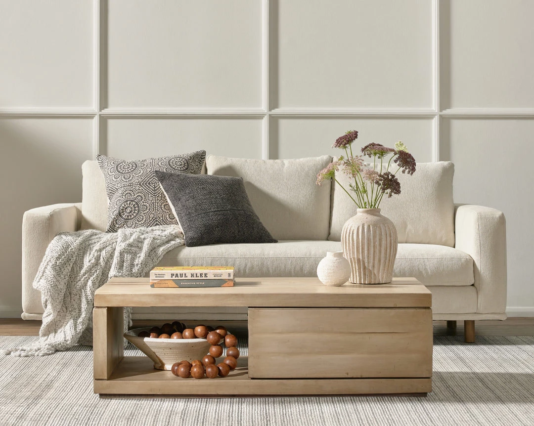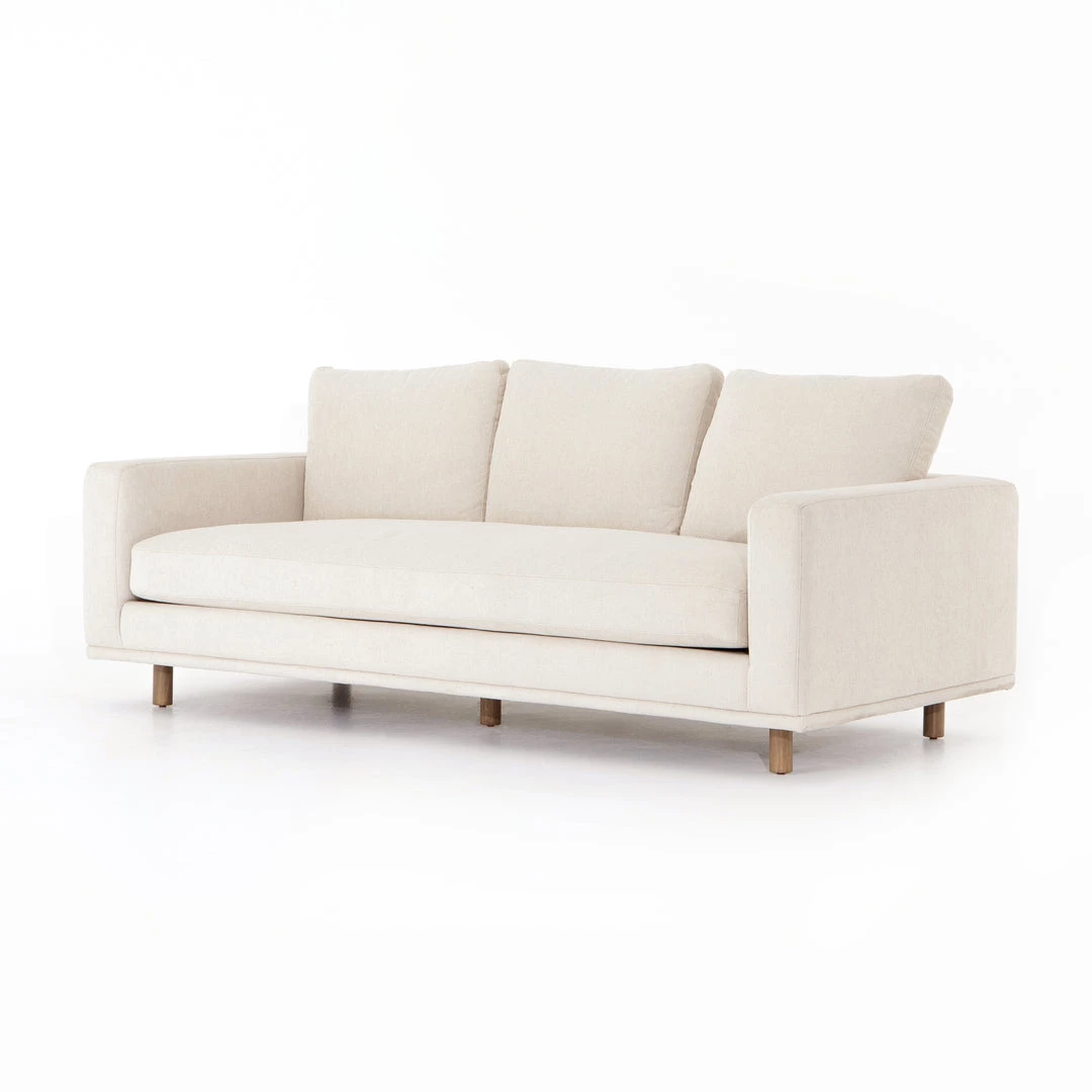 Performance-grade fabric brings surprising livability to a show-stopping silhouette. Pristinely tailored ivory upholstery exudes elegance, with clean track arms and loose feather-blend cushioning for total comfort.