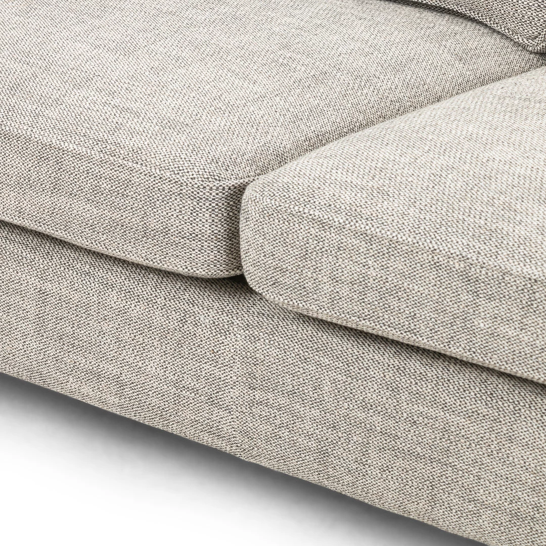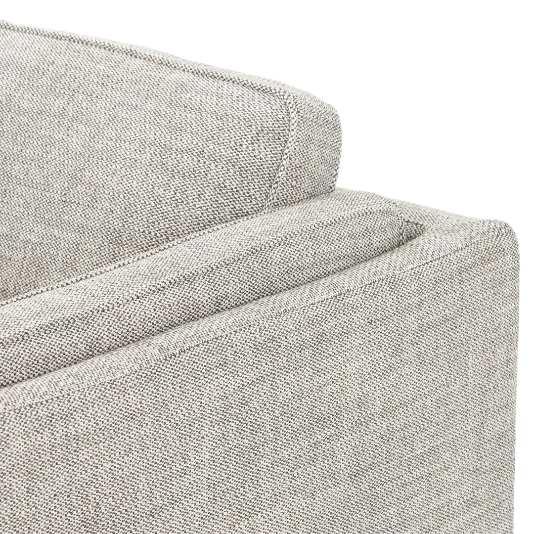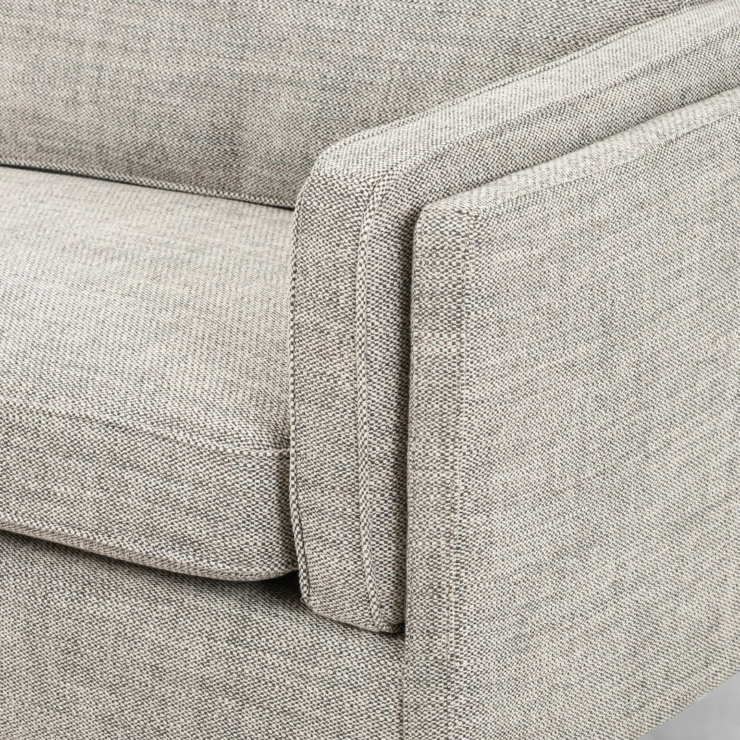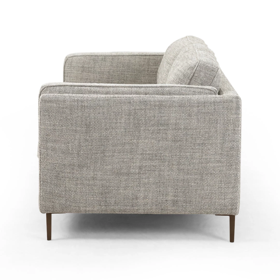 Clean, mid-century styling adopts modernity via textural upholstery in an inviting cream-infused grey. Tailored lines meet slim legs of bronze-finished aluminum for a sophisticated finishing touch.