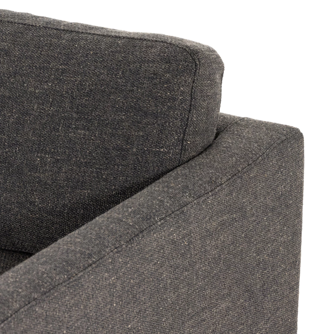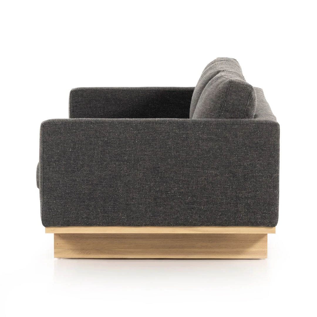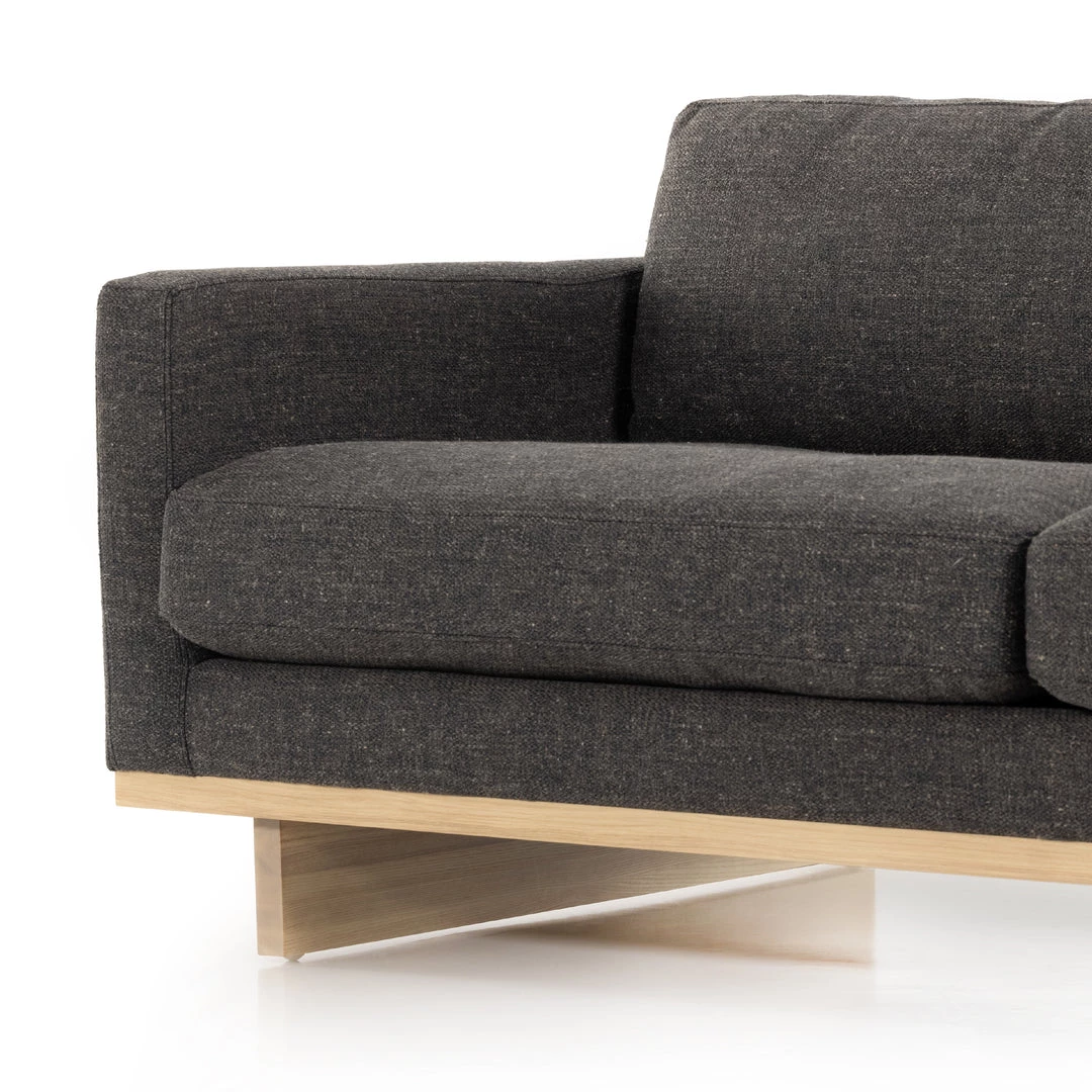 Classic goes contemporary. A cocoa-finished parawood base supports low, deep seating of performance-grade upholstery in an invitingly neutral taupe, with track arms for a clean touch.