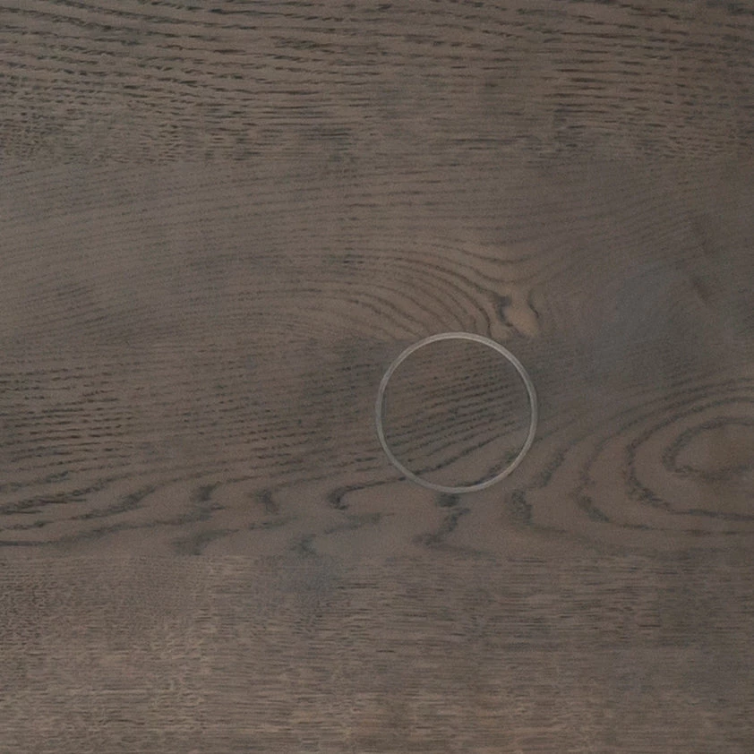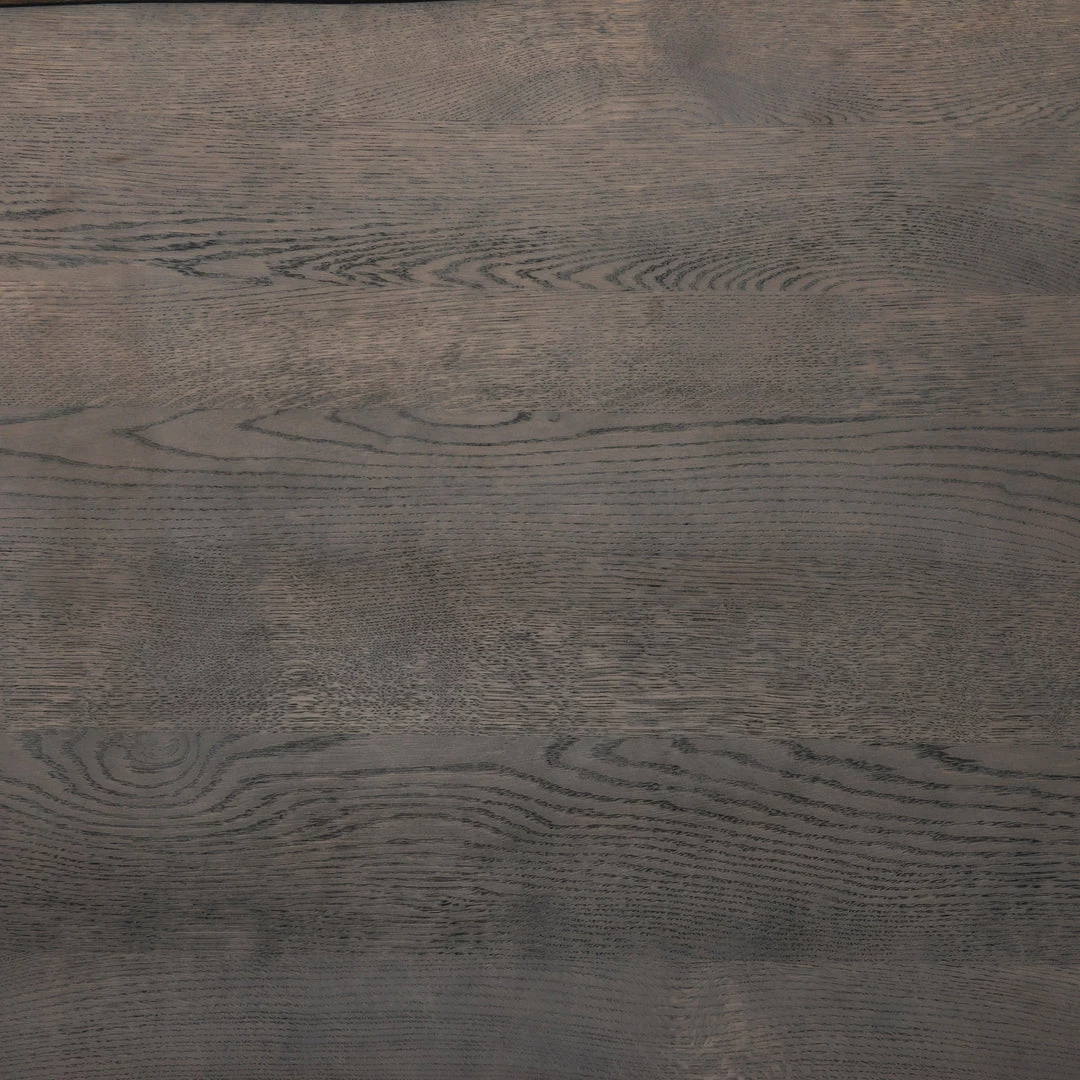 Finished in a warm espresso, a grandly scaled live-edge dining table of solid European oak features a classic A frame, wide stance and thick top, with iron ring inlay – a fresh, decorative ode to traditional butterfly joinery.