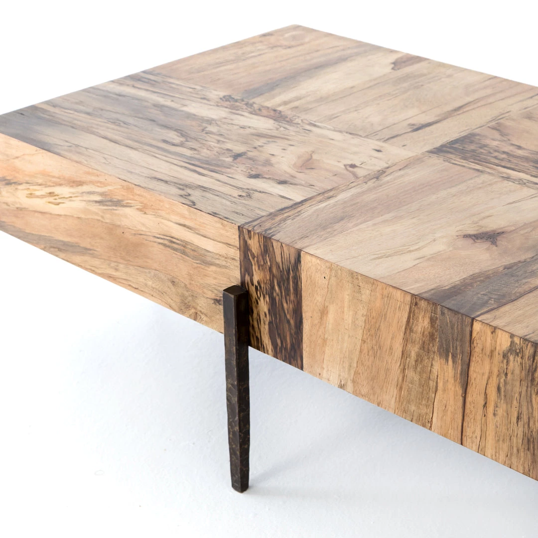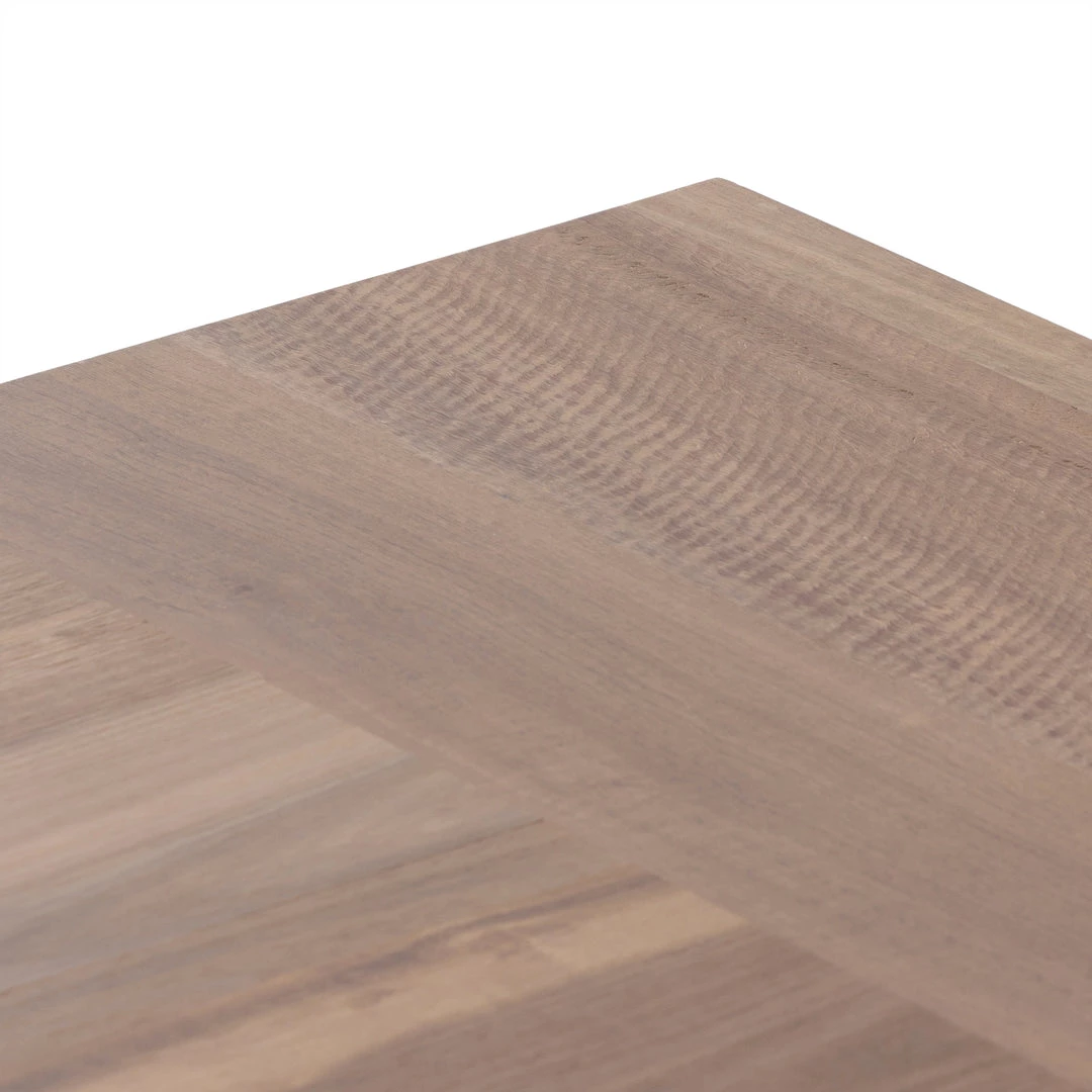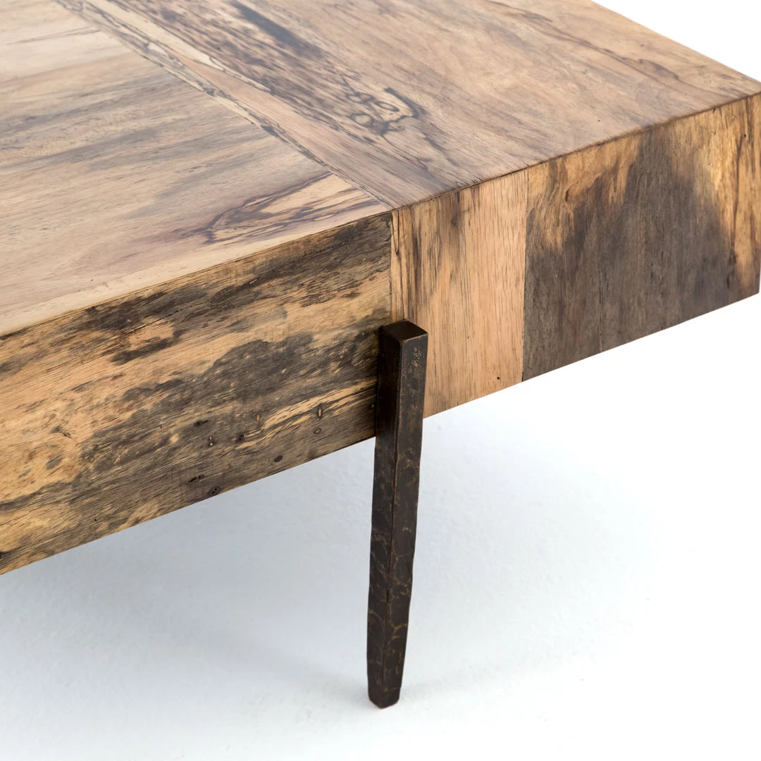Streamlined shaping adopts rich character via natural materials. A thick slab of pine topped with a thick walnut veneer rests within a slim, four leg base of dark hammered iron. Clean corners bring a tailored touch to weighty woods, spurring a perfect blend of styles.