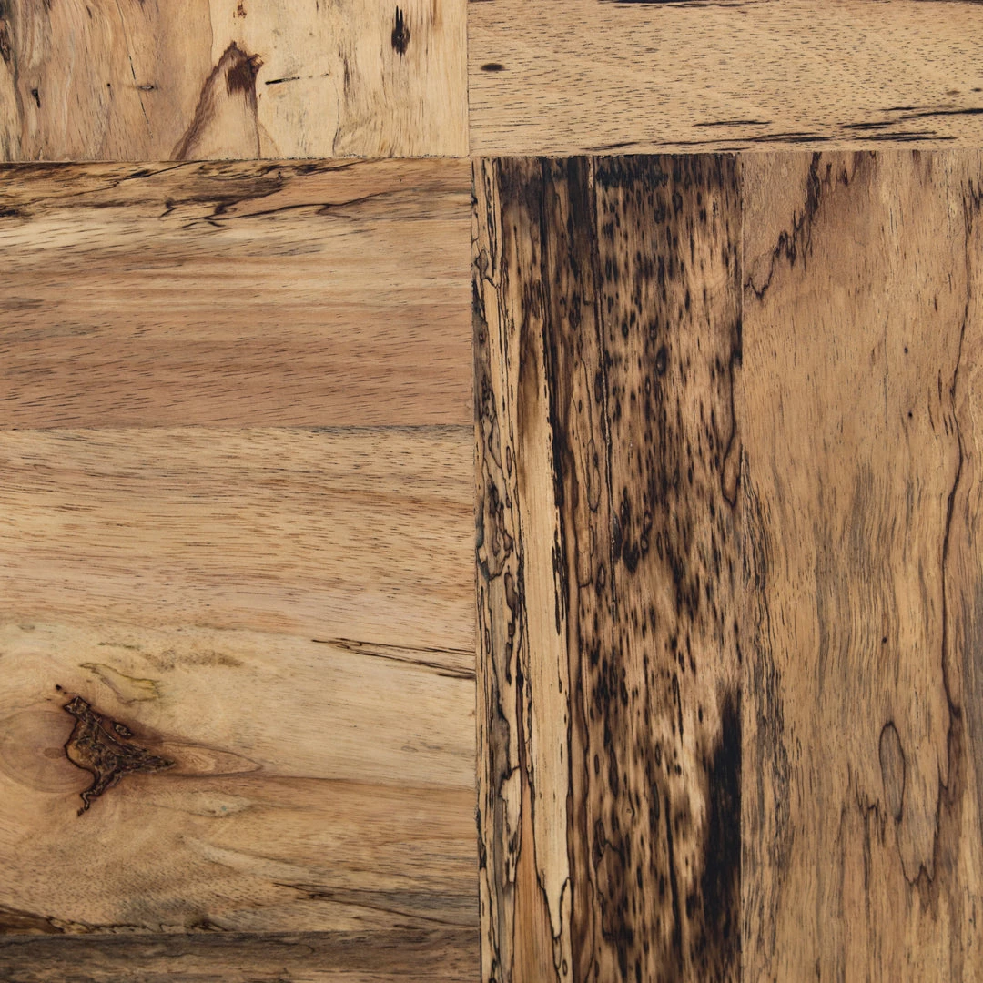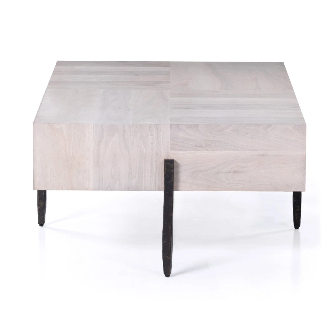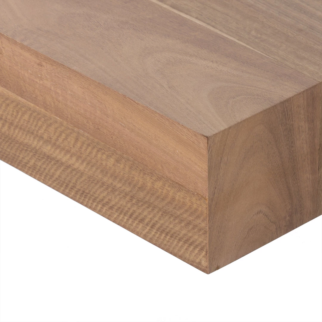 Streamlined shaping adopts rich character via natural materials. A thick slab of pine topped with a thick walnut veneer rests within a slim, four leg base of dark hammered iron. Clean corners bring a tailored touch to weighty woods, spurring a perfect blend of styles.