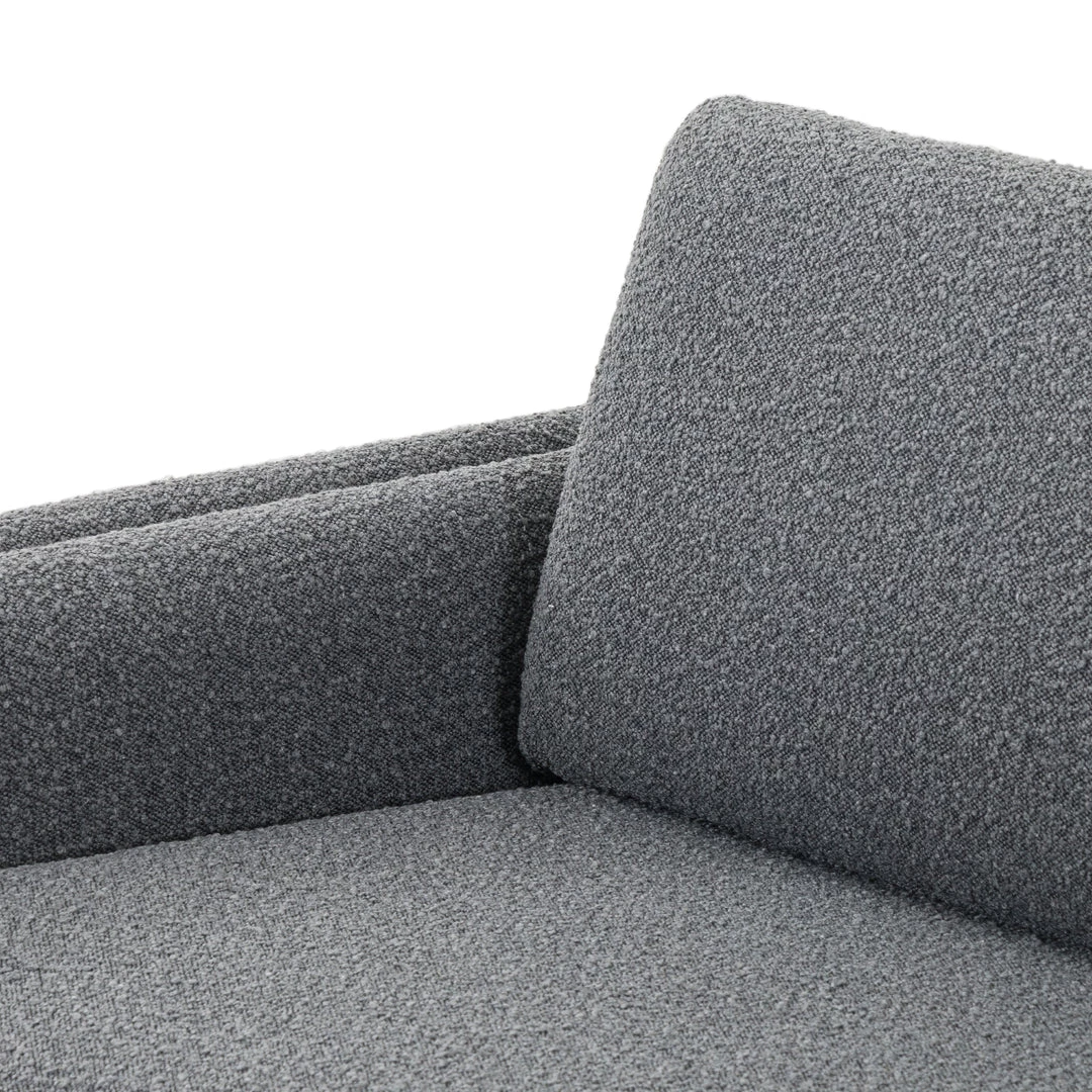 Channel surfing. With a sense of Eighties-inspired drama, doubled channeling adds a layered, linear look to boucle-upholstered sofa seating, with loose feather-fiber blend cushioning for comfort.