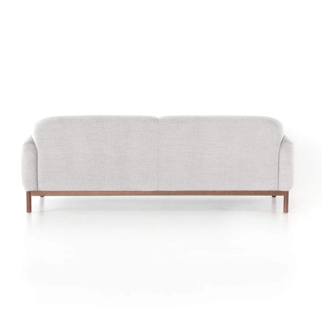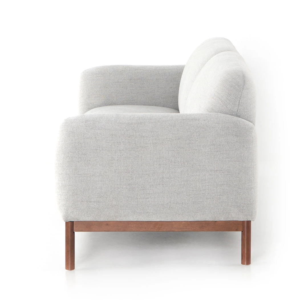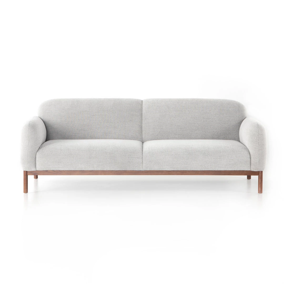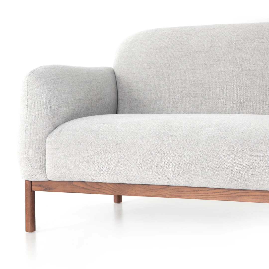 Sink-in softness with structure. Atop a slim and simple brown oak frame sits shapely sofa seating upholstered with a textural pebble hue.