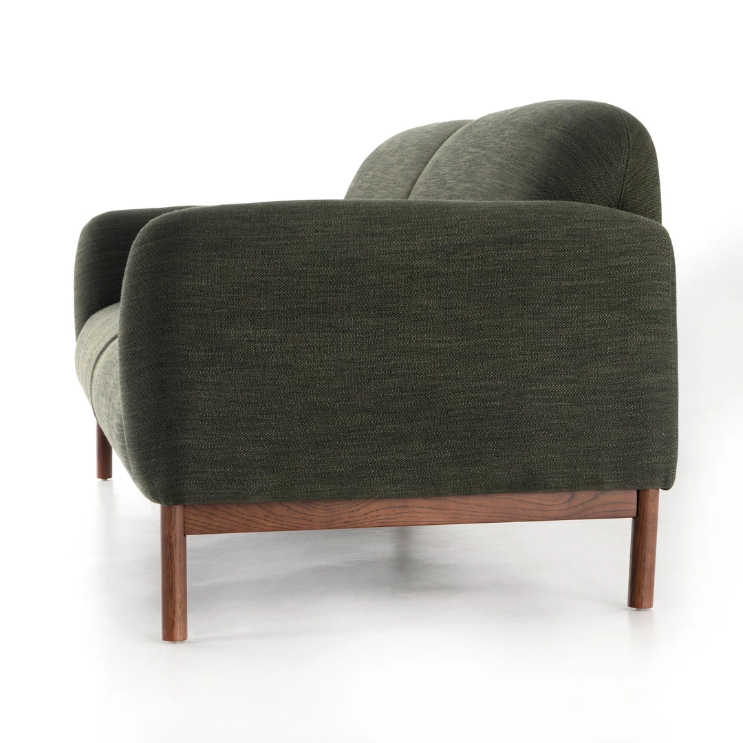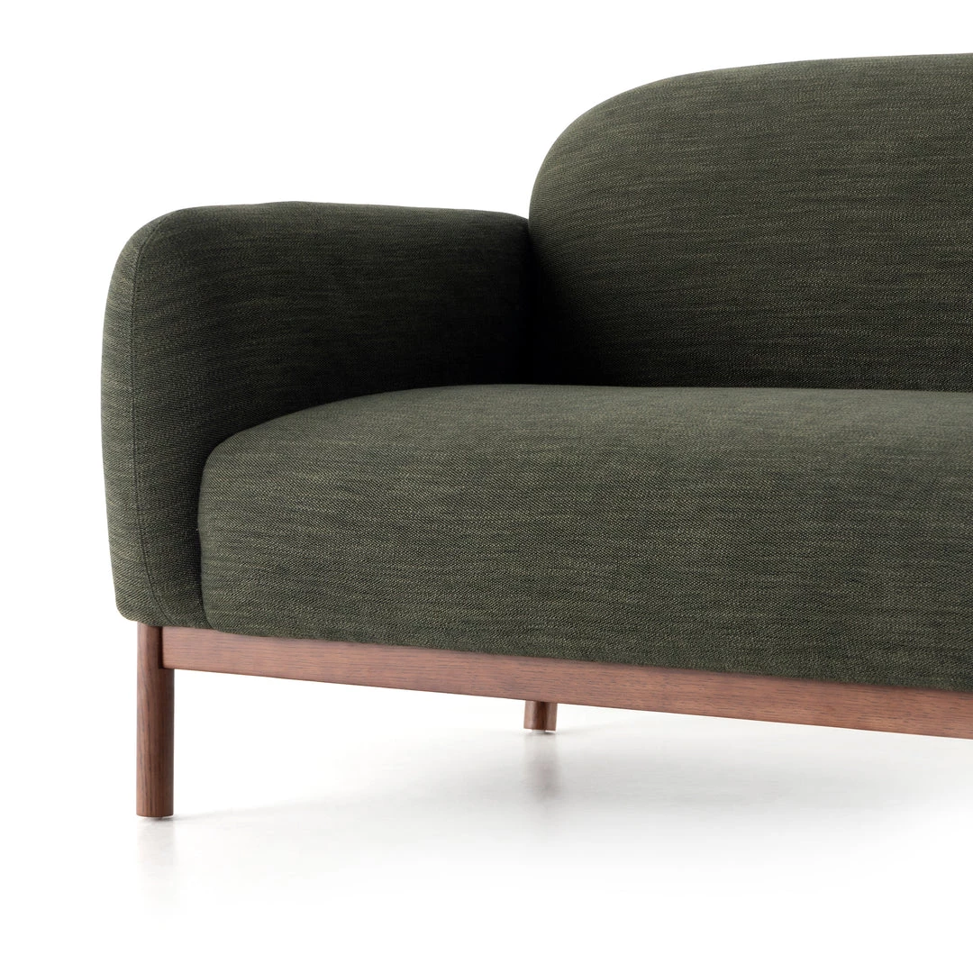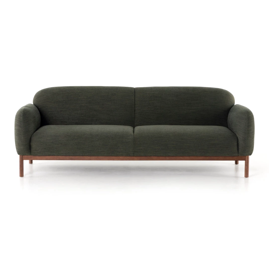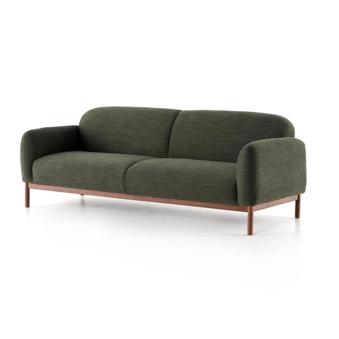 Sink-in softness with structure. Atop a slim and simple brown oak frame sits shapely sofa seating upholstered with a textural pebble hue.