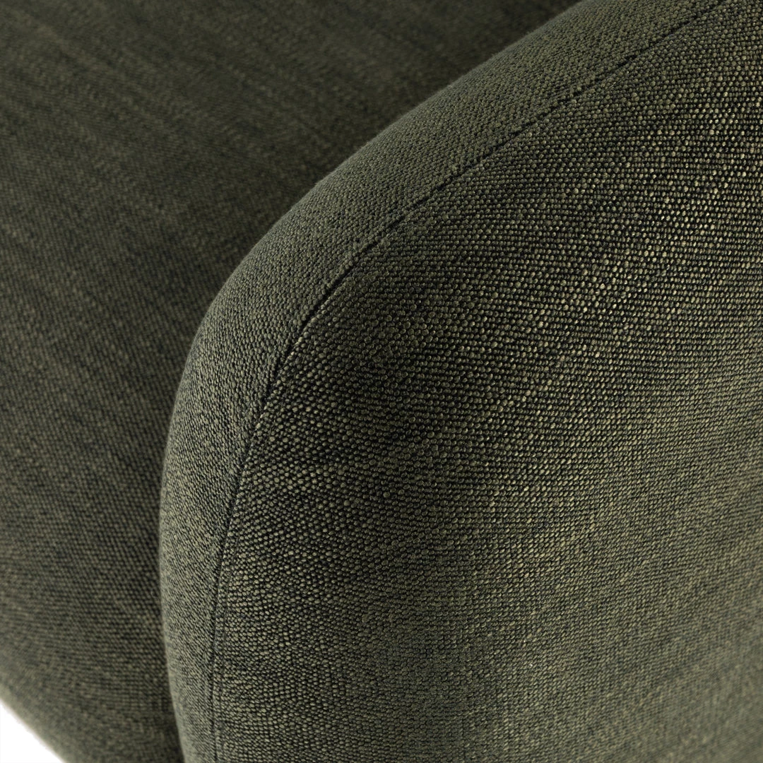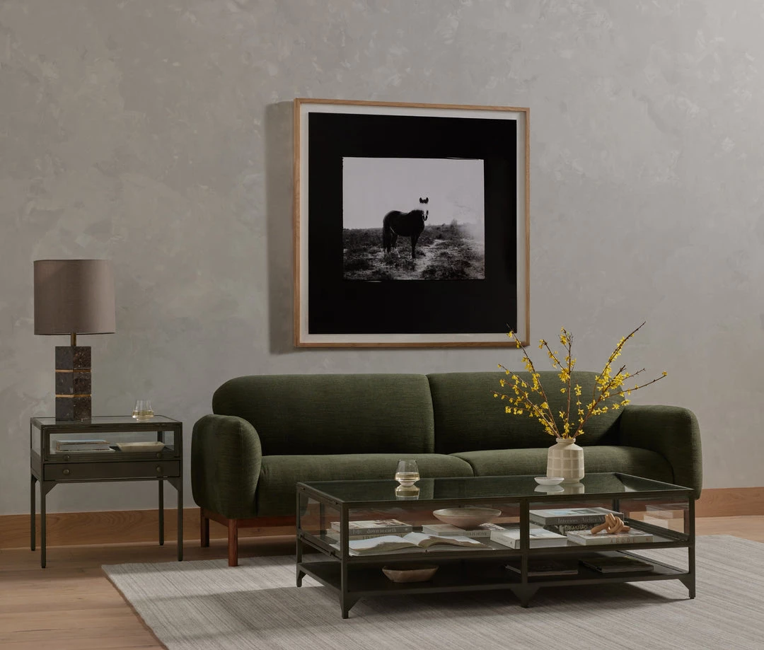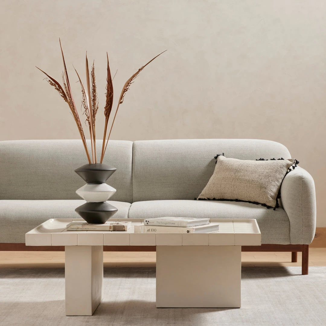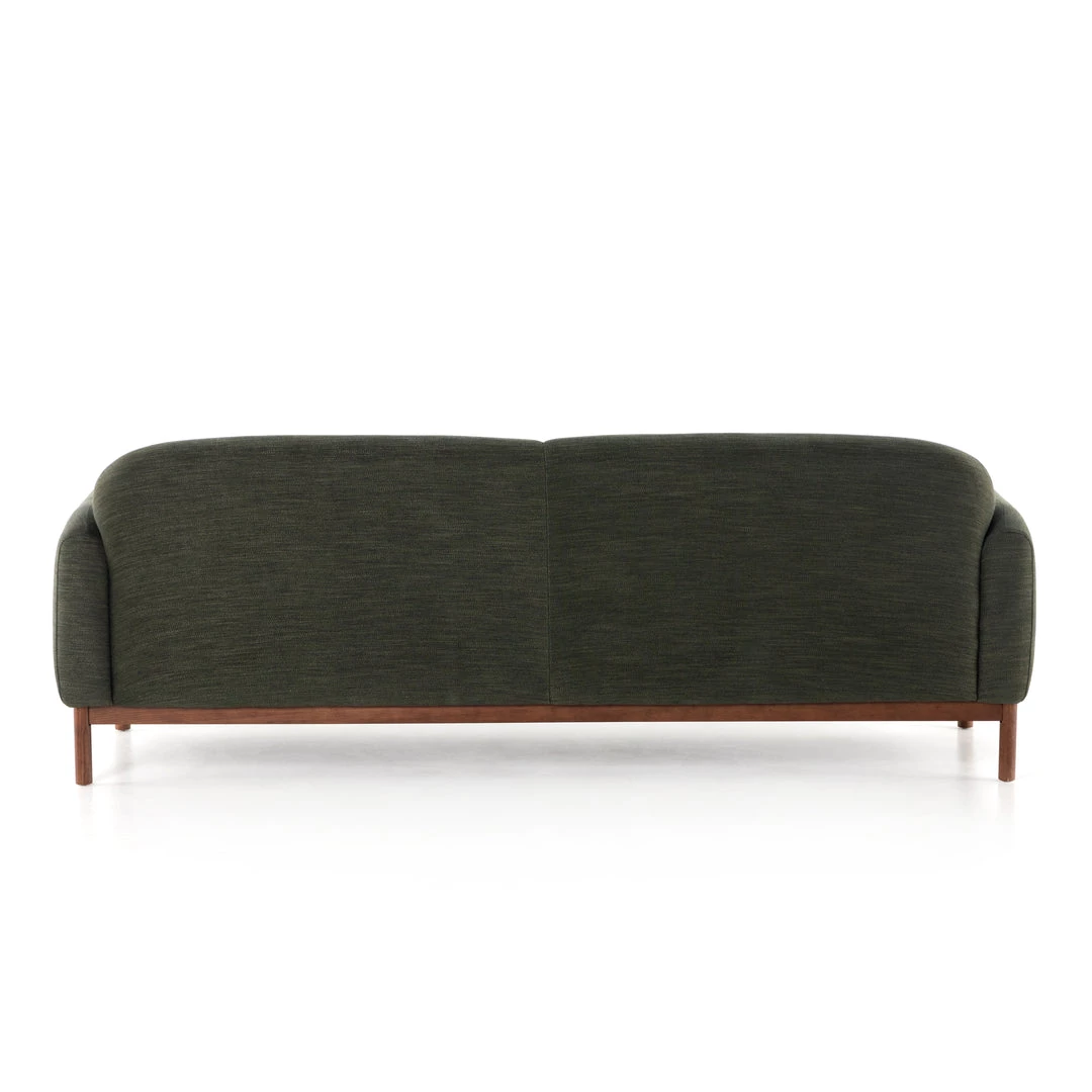 Sink-in softness with structure. Atop a slim and simple brown oak frame sits shapely sofa seating upholstered with a textural pebble hue.