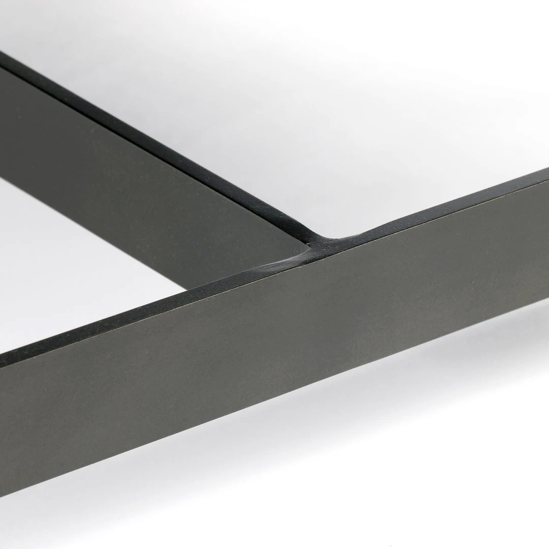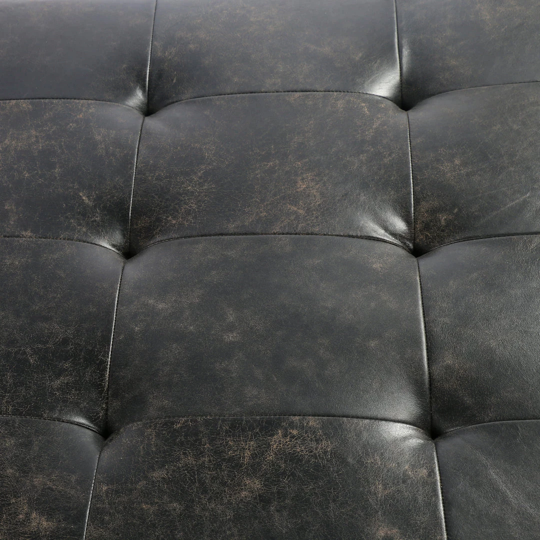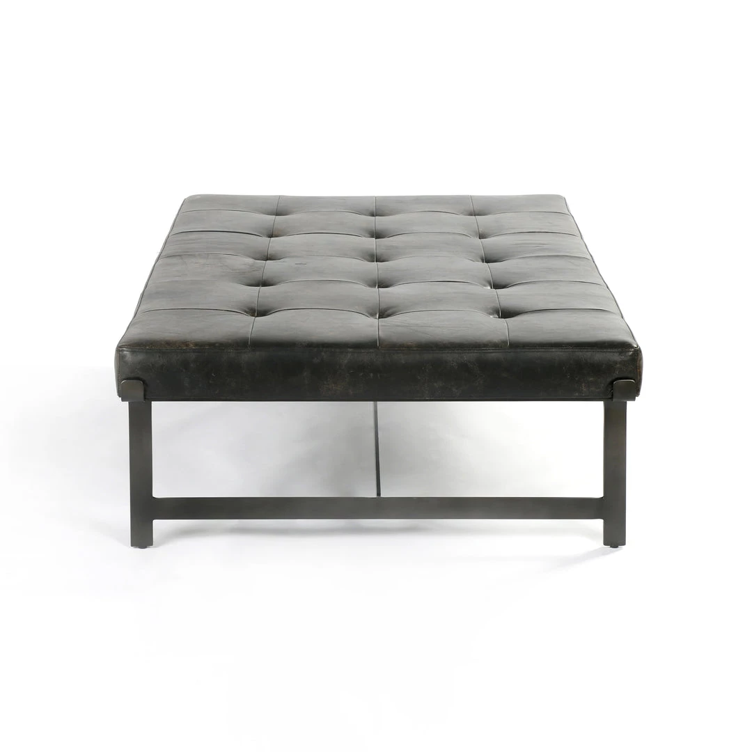Soft top-grain leather in ebony takes on traditional tufting, while flat iron legs usher a trend-forward touch to the bench-style coffee table.