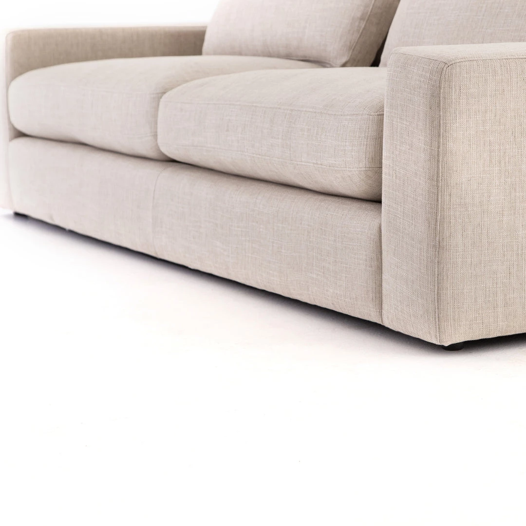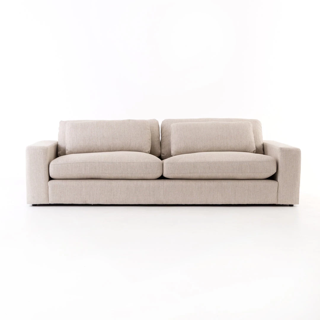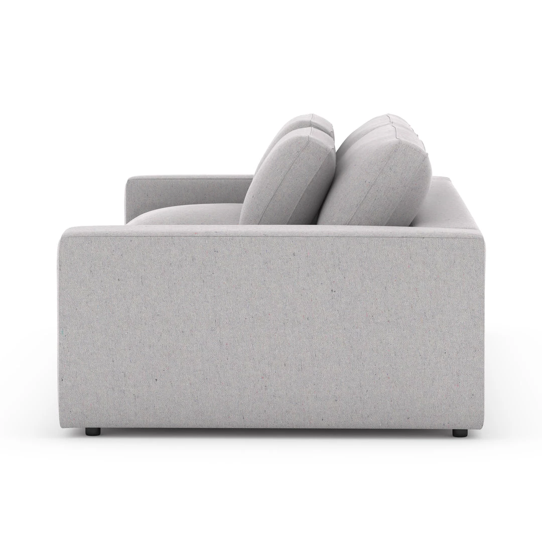 Deep, modern and seductive. This dramatic, spacious sofa is covered in a sleek, neutral grey fabric that mixes well with any color palette.