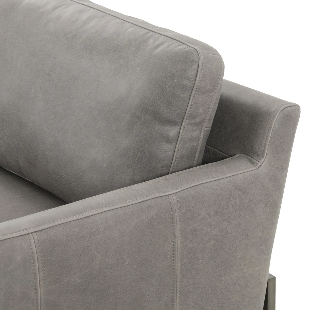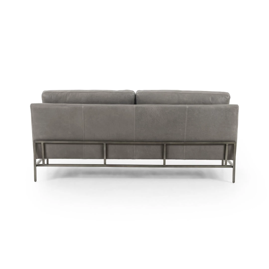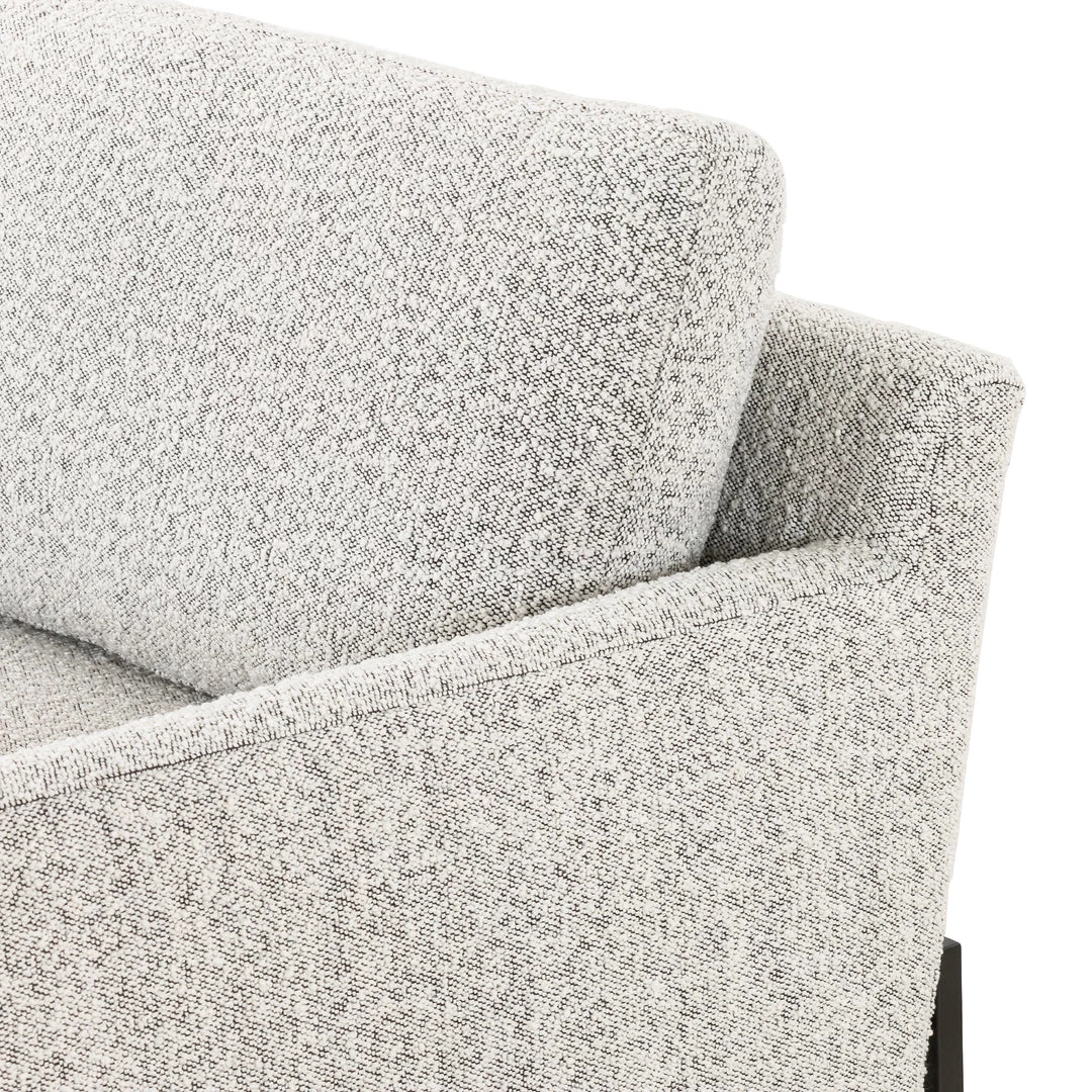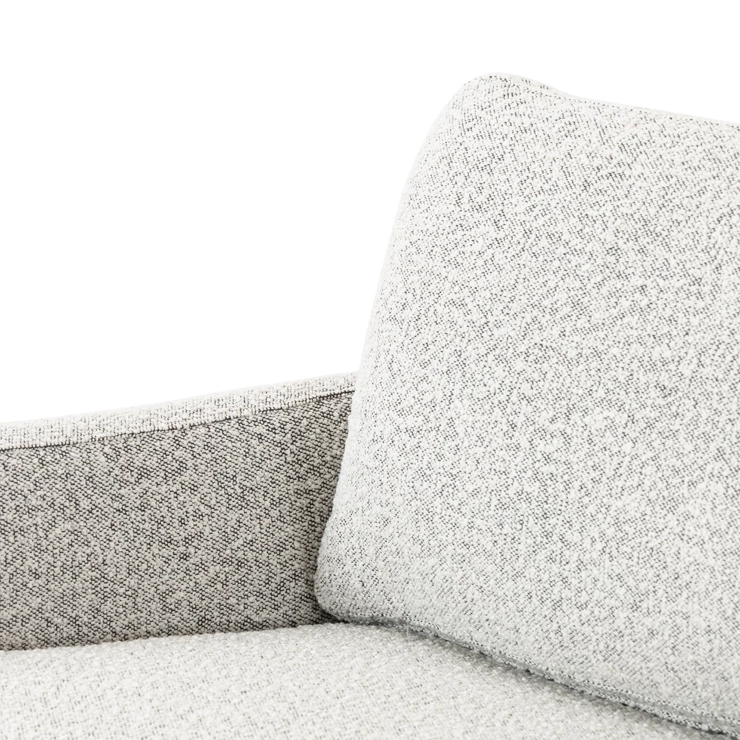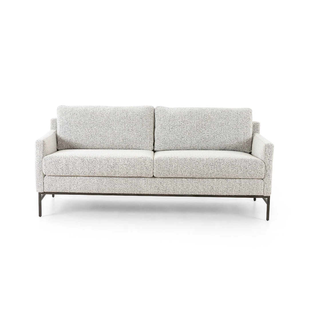 Plush and modern-minded. Atop an airy, bronze-finished iron base, thick, boucle-like upholstery features clean, angular track arms and comfy cushioning, for the best of both worlds.