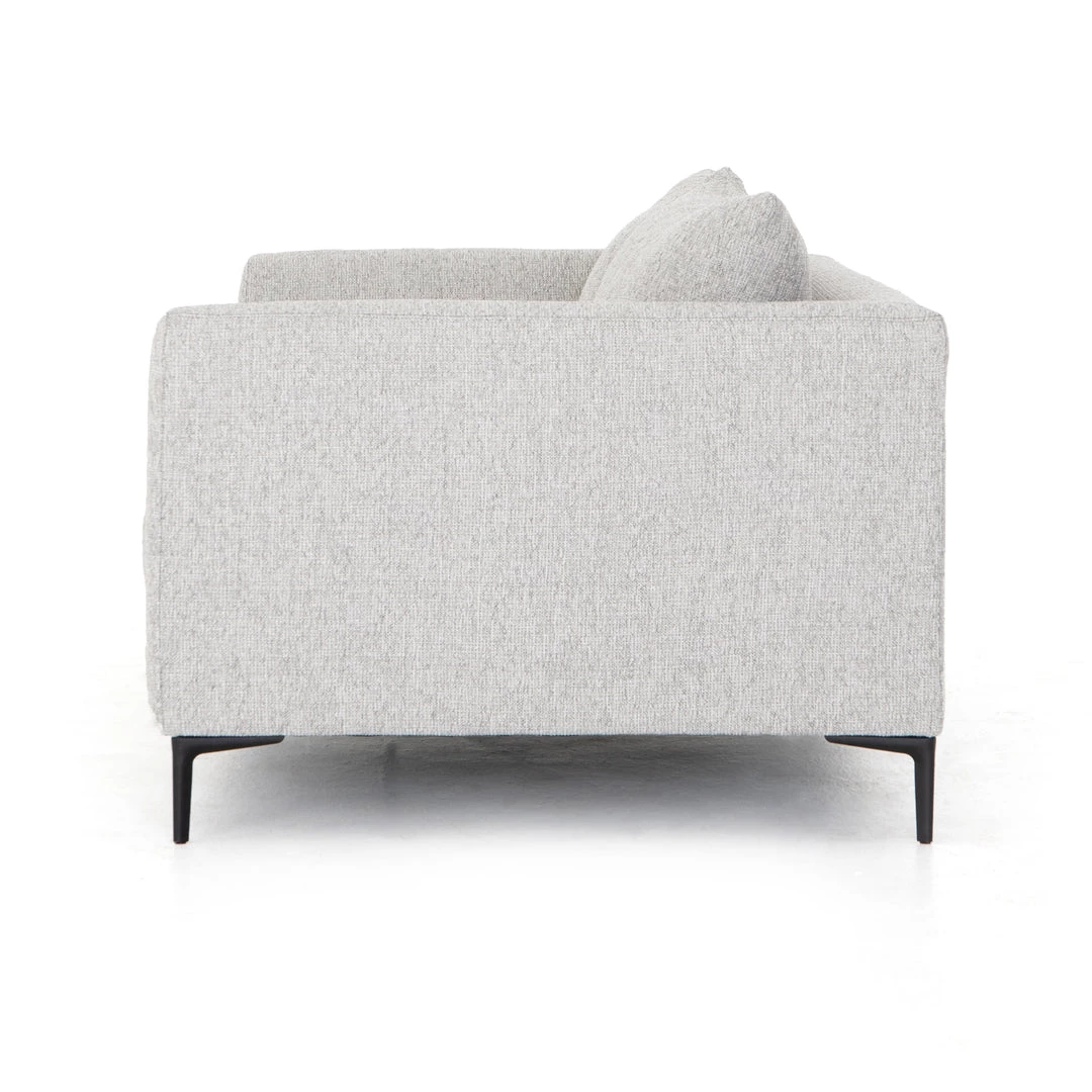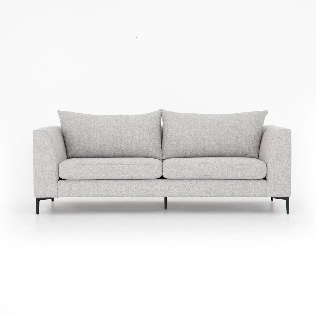 High-but-understated style. A textural light grey covering of performance-grade upholstery welcomes bullnose seating and knife-edge pillows, with a slope arm and T-shape black iron base for a hint of modern edge.