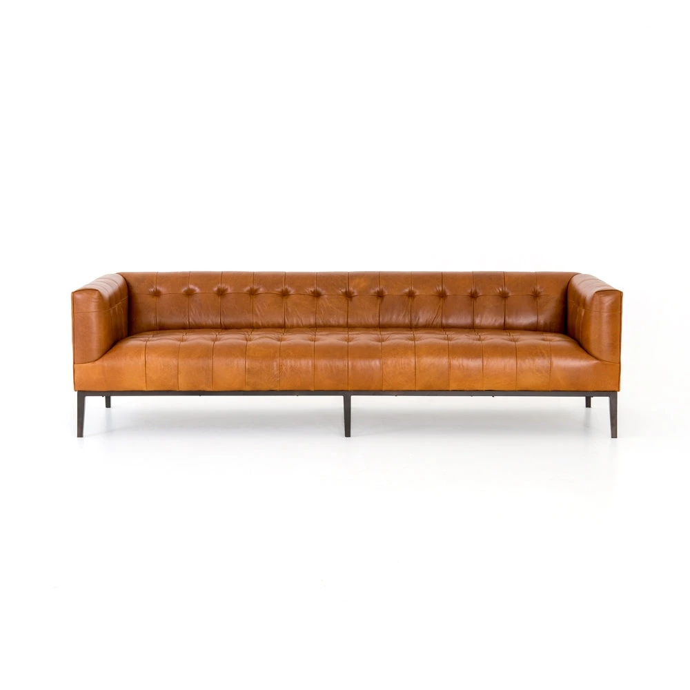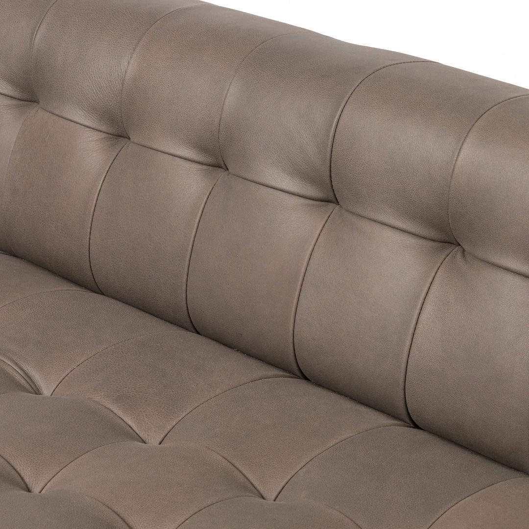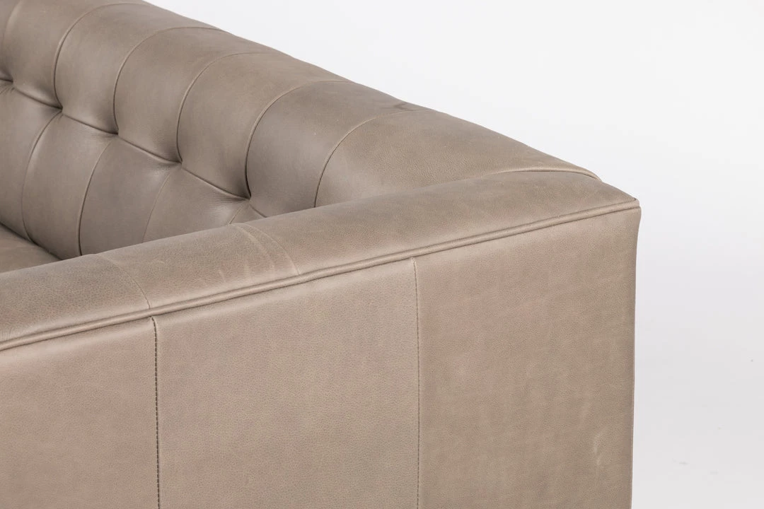 Hand tufting lends equal parts comfort and sophistication to sycamore-colored top-grain leather and squared-off arms. Slim gunmetal-finished legs add an industrial touch to trend-forward seating.
