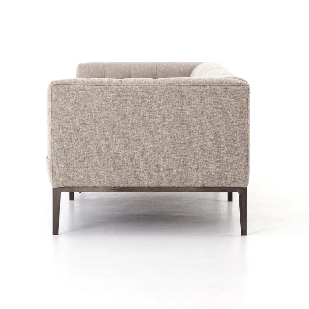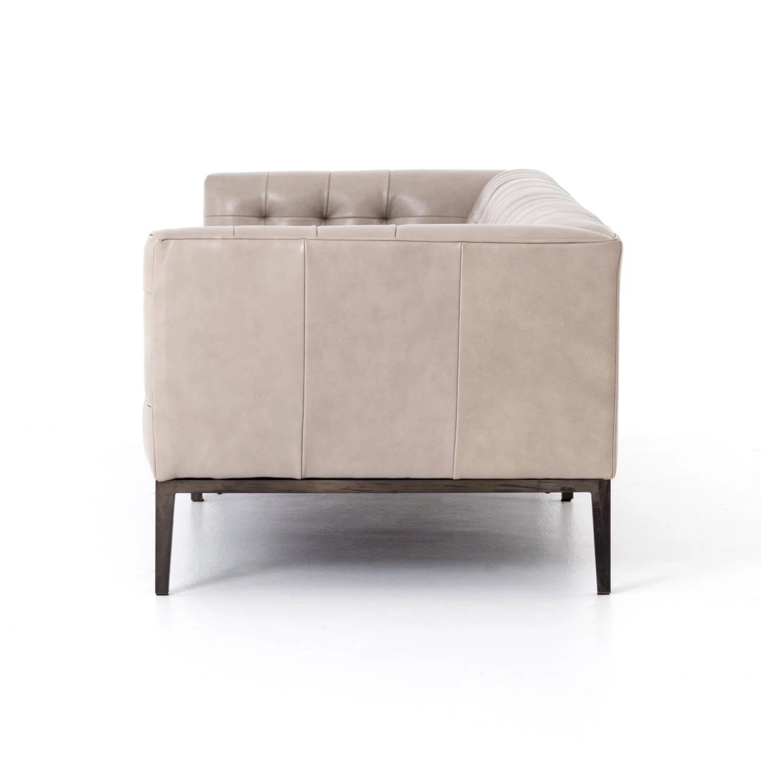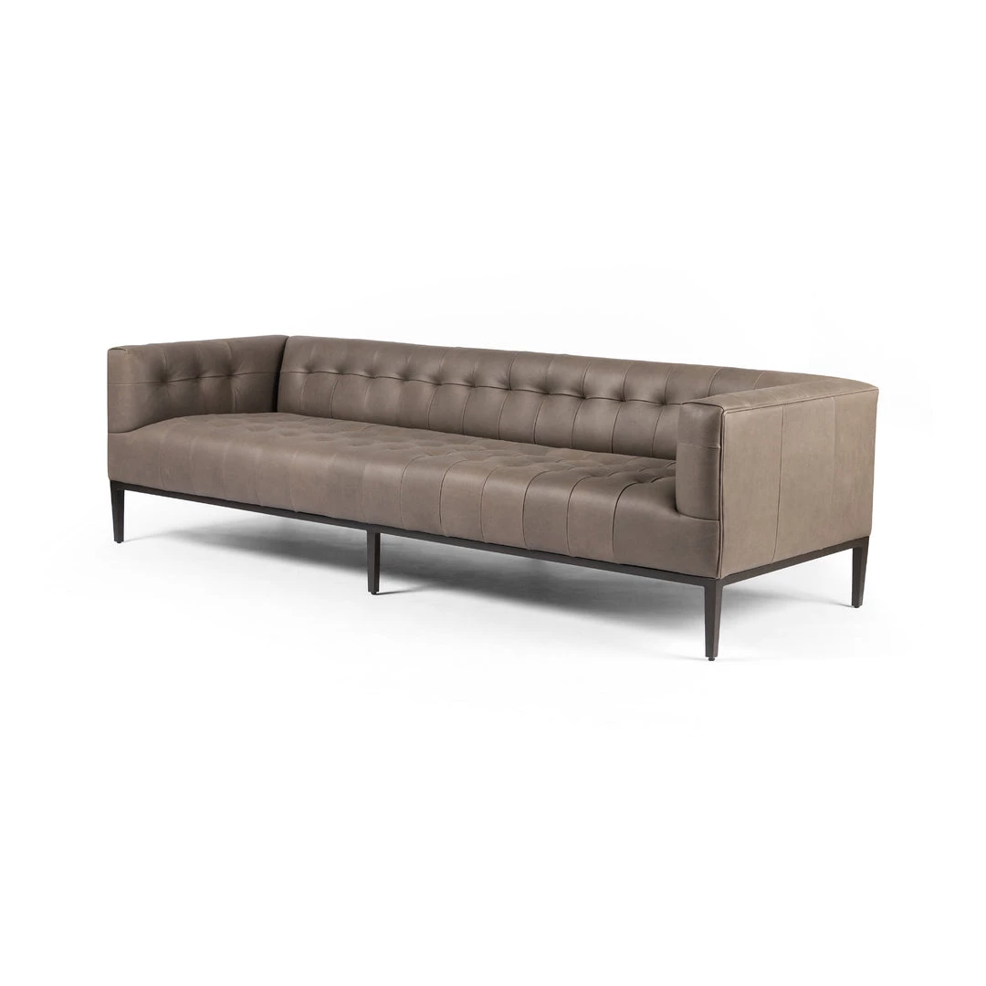 Hand tufting lends equal parts comfort and sophistication to sycamore-colored top-grain leather and squared-off arms. Slim gunmetal-finished legs add an industrial touch to trend-forward seating.