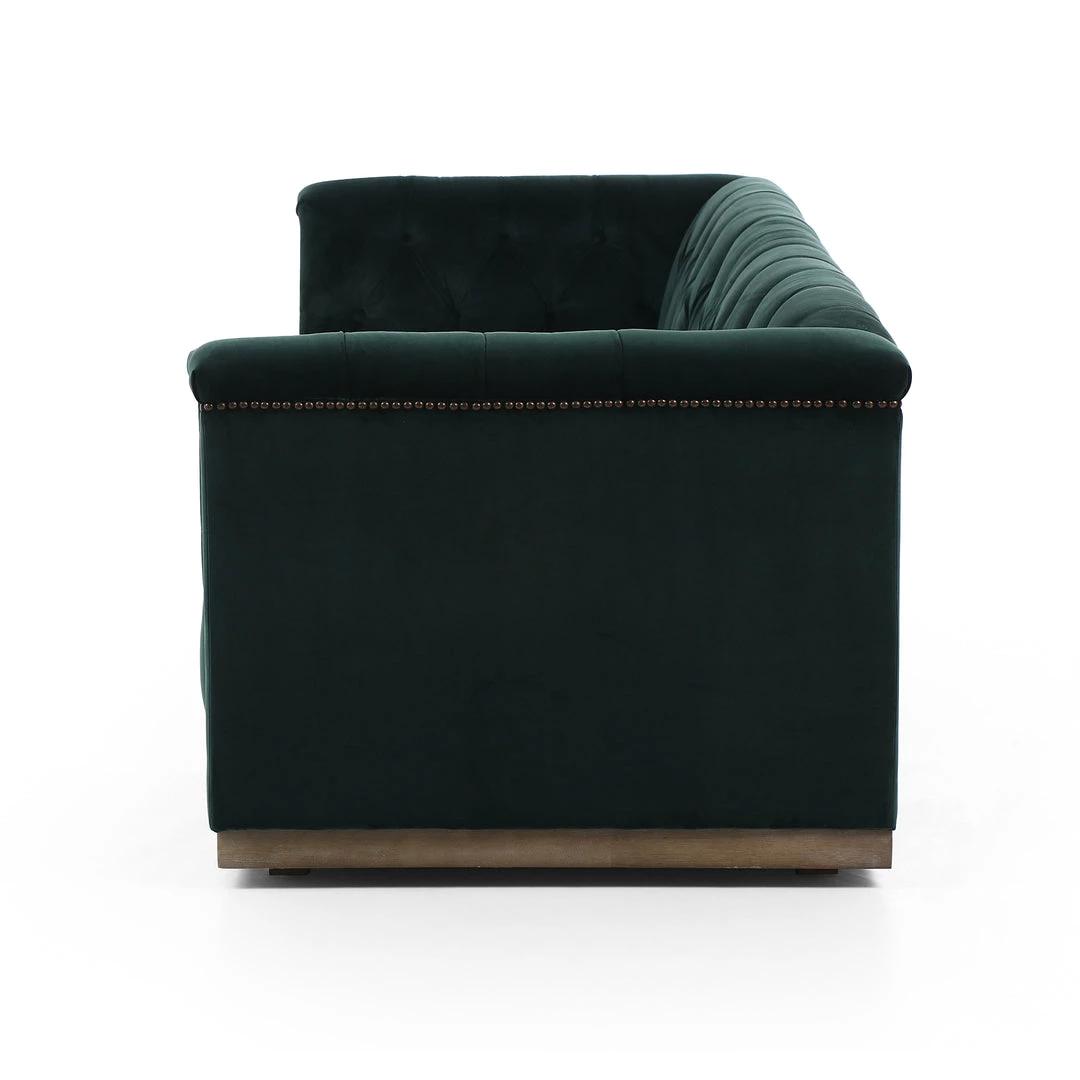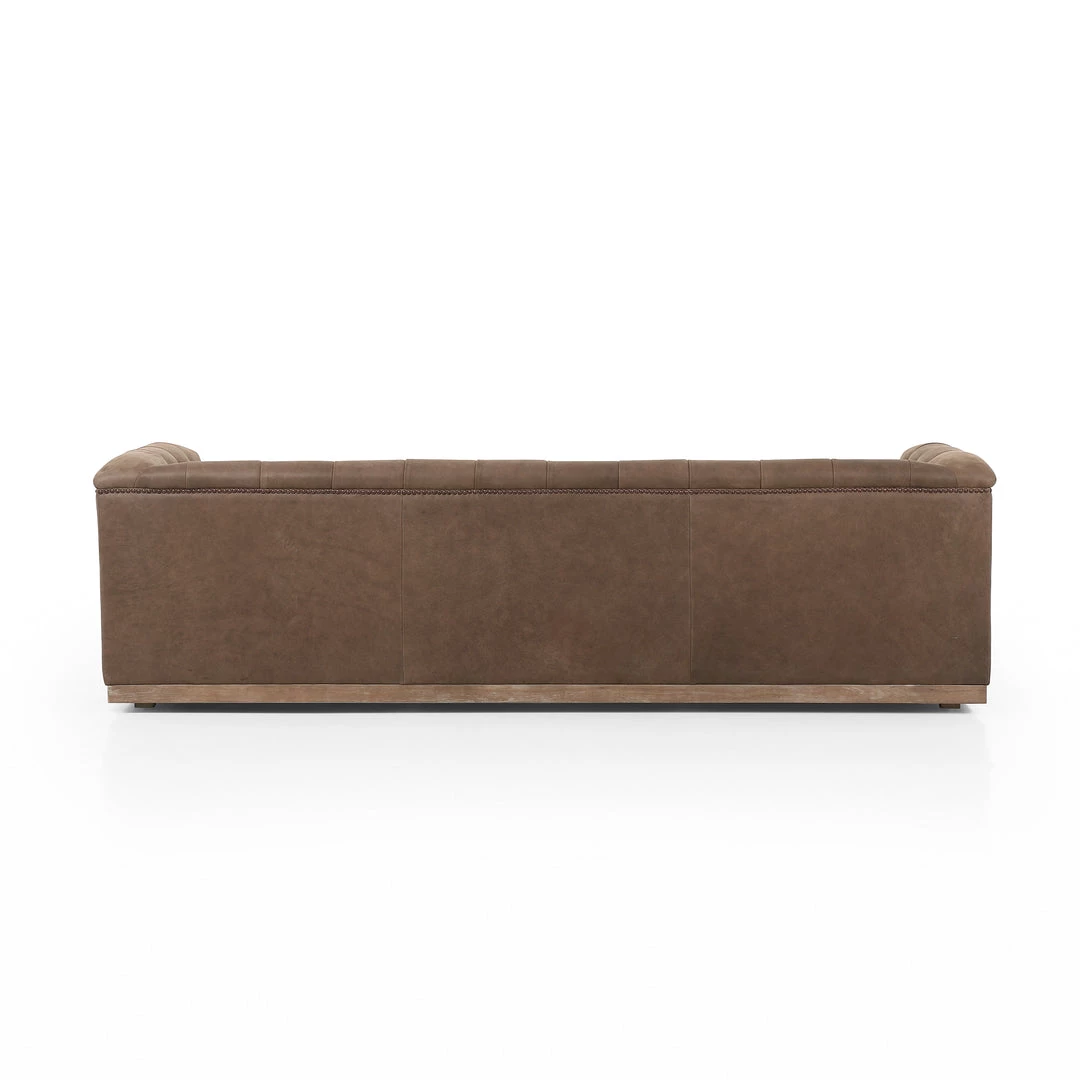 This modern take on the classic library sofa is covered in distressed black top-grain leather and mounted on a weathered oak base. Aged bronze nailheads add modernity.