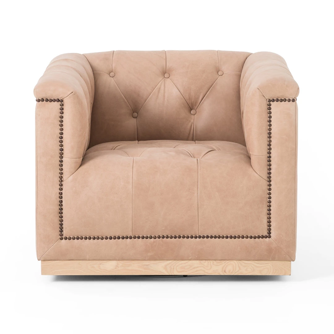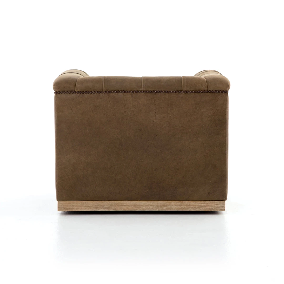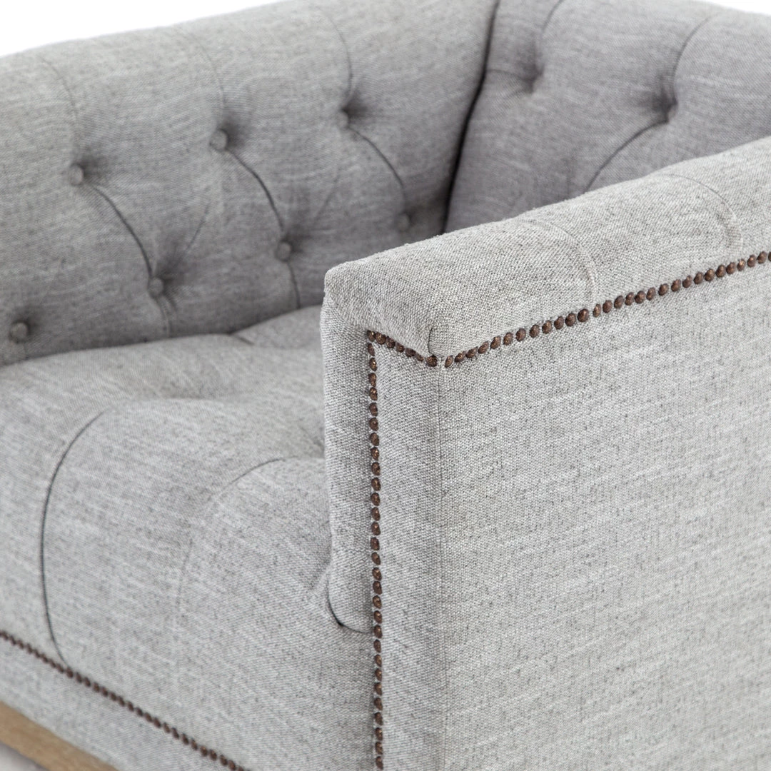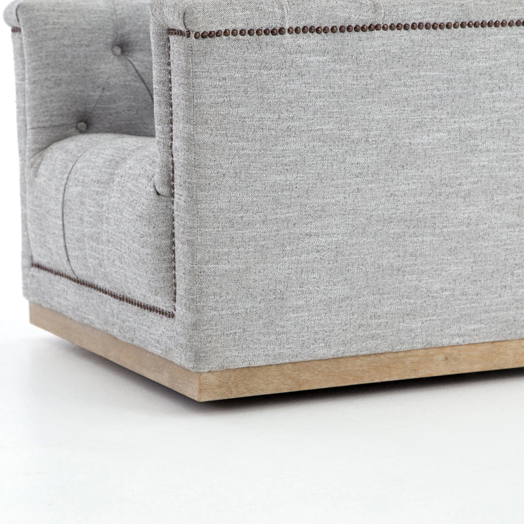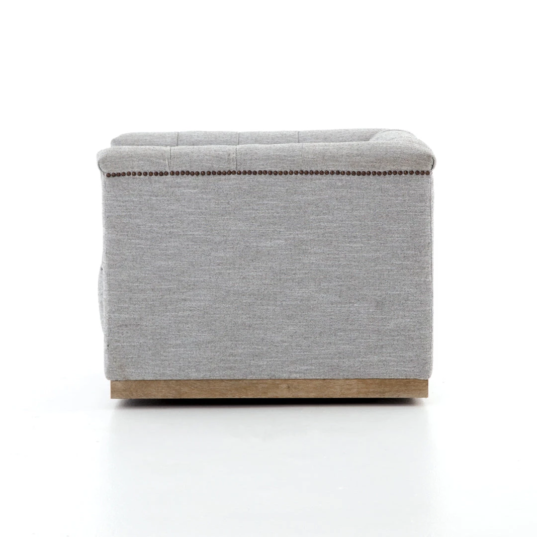 This modern take on the classic library chair is covered in soft grey polyester and mounted on a smooth swivel base of whitewashed parawood. Metal nailhead trim adds a pop of industrial contrast in aged bronze.