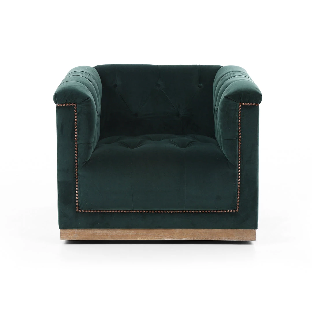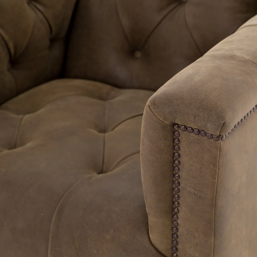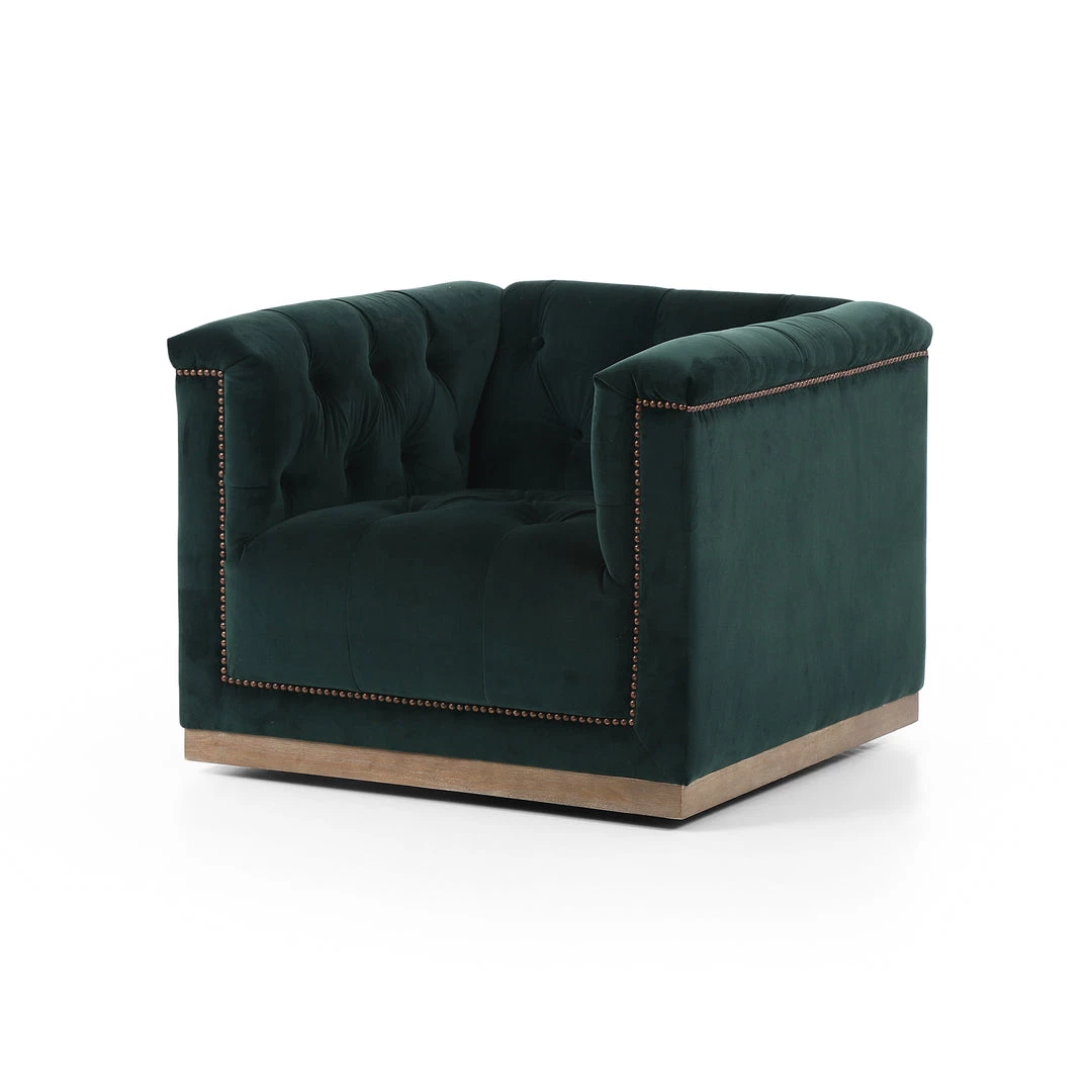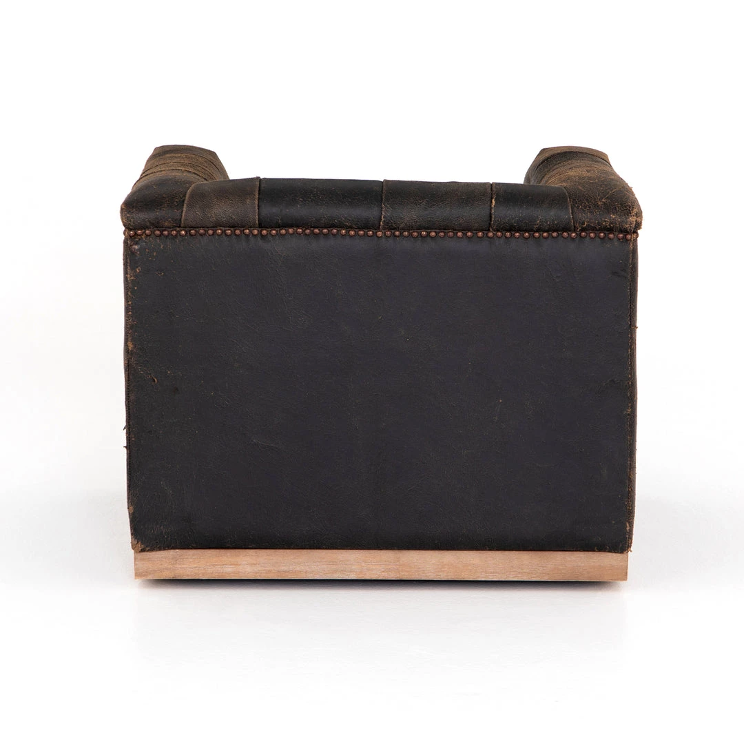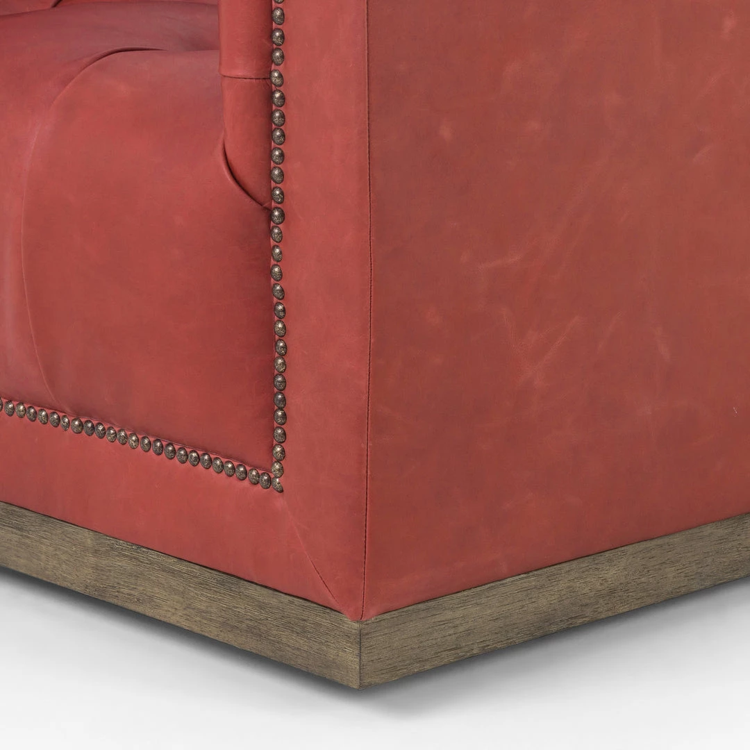 This modern take on the classic library chair is covered in soft grey polyester and mounted on a smooth swivel base of whitewashed parawood. Metal nailhead trim adds a pop of industrial contrast in aged bronze.