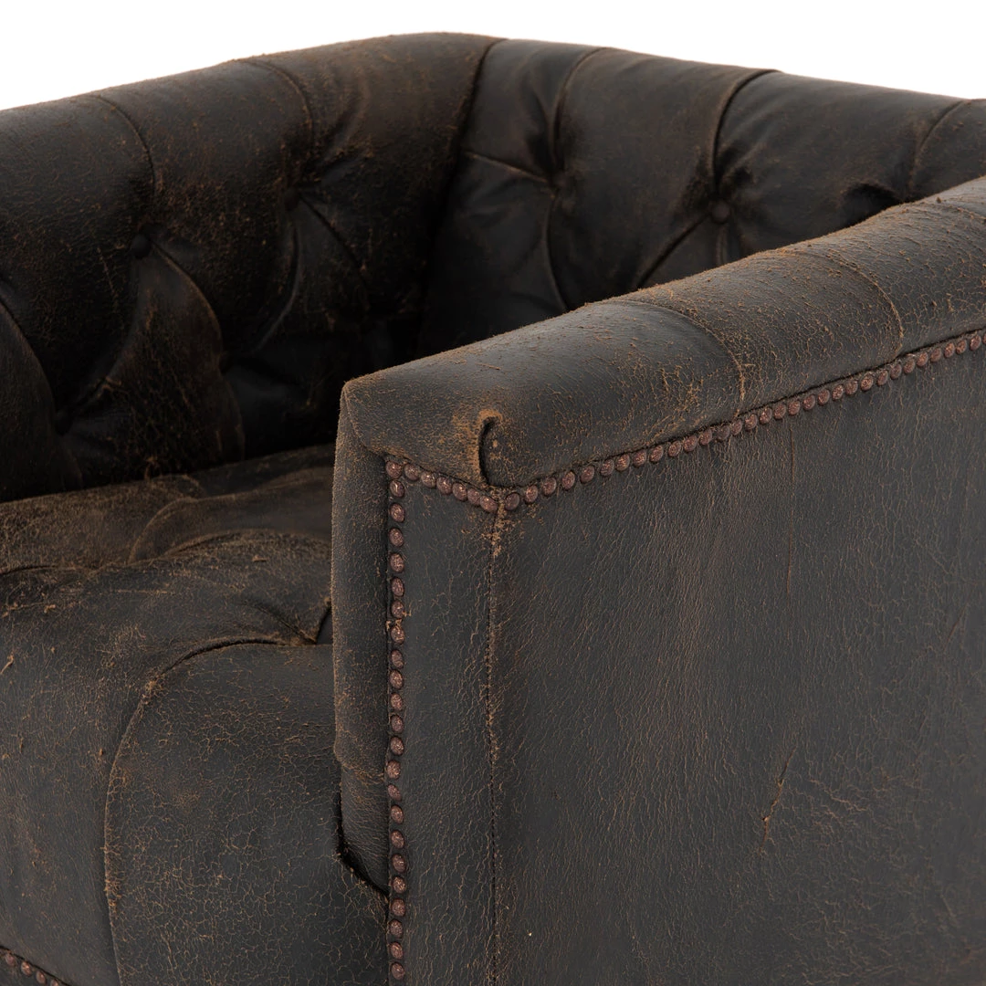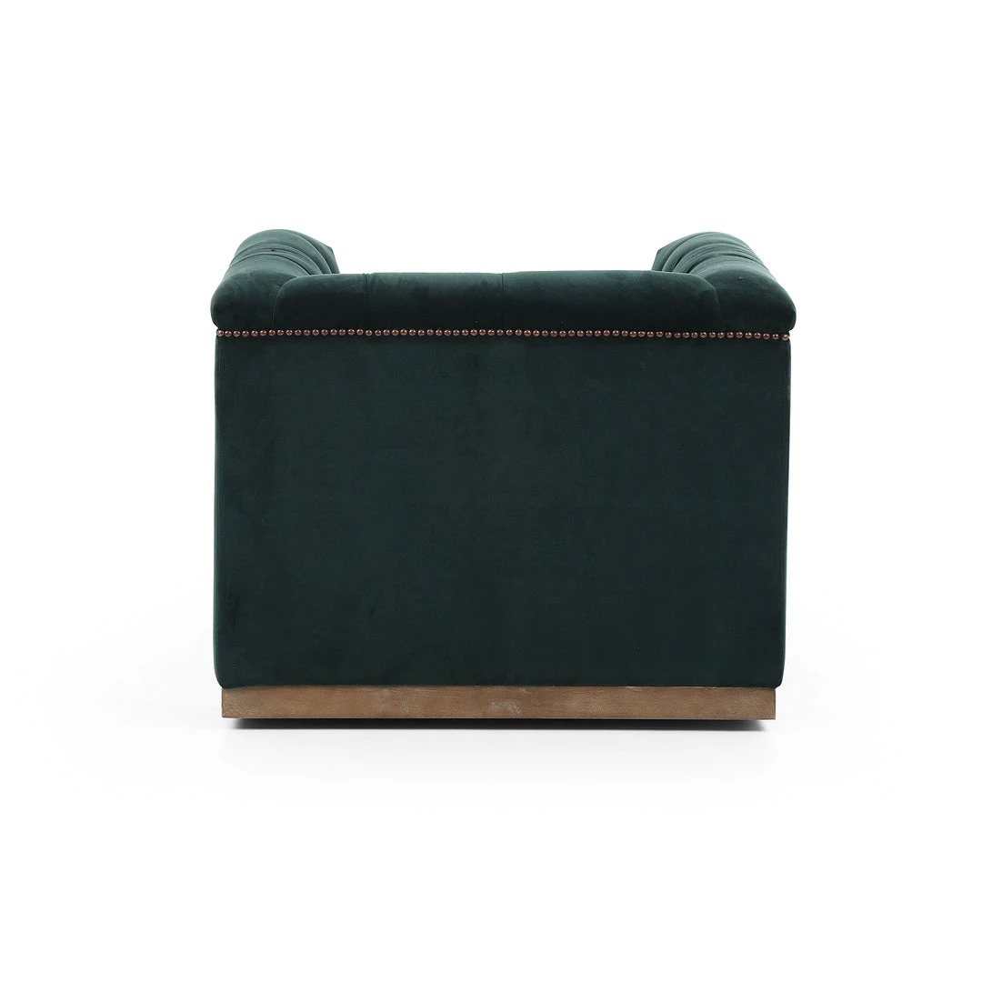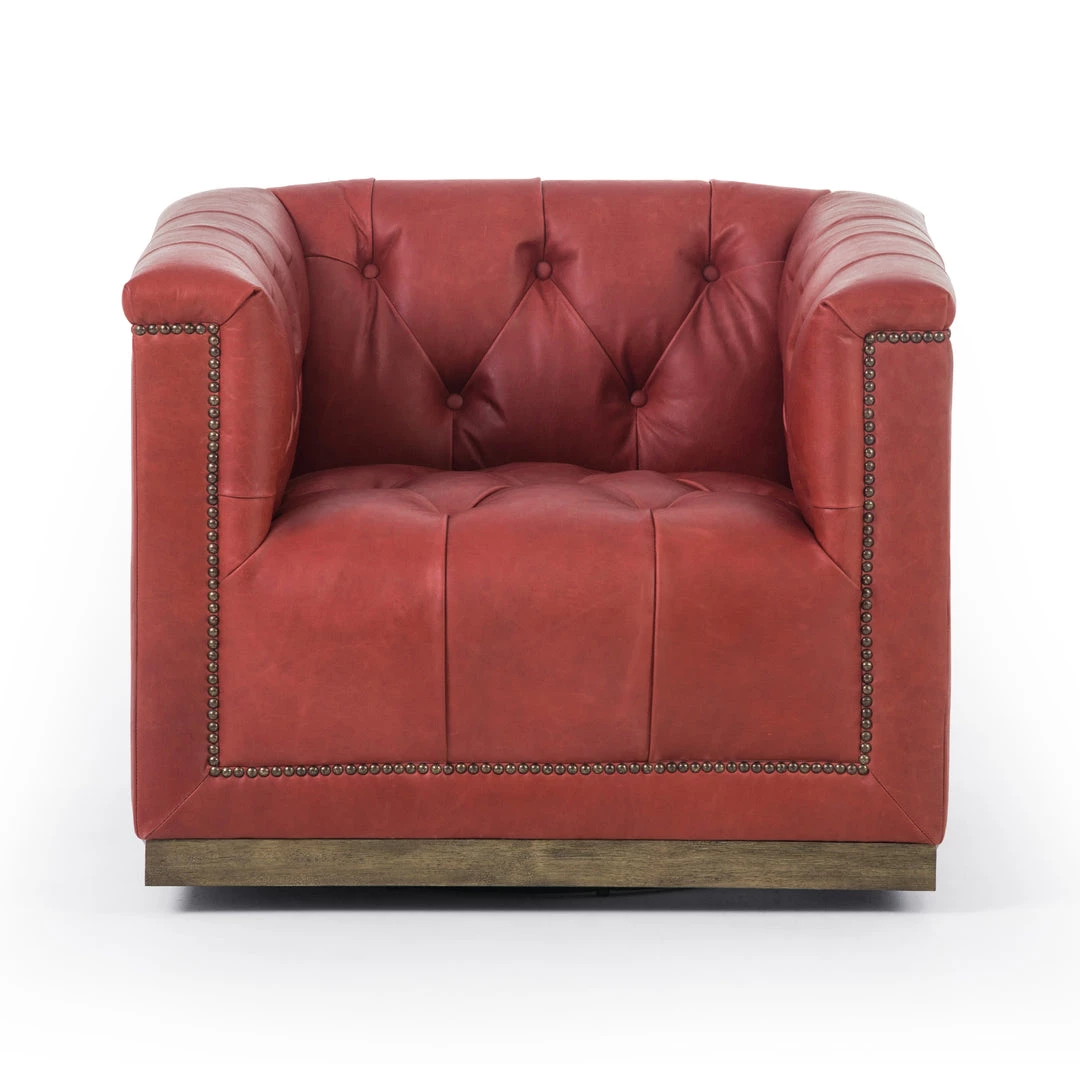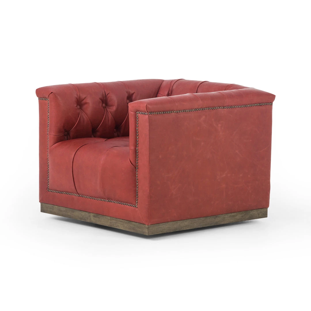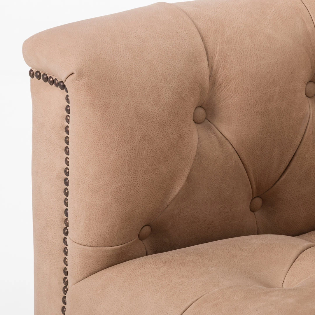 This modern take on the classic library chair is covered in soft grey polyester and mounted on a smooth swivel base of whitewashed parawood. Metal nailhead trim adds a pop of industrial contrast in aged bronze.