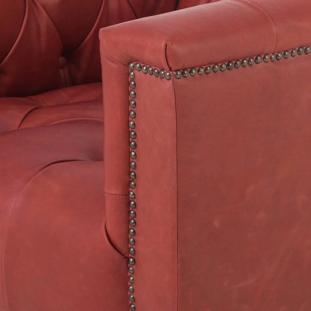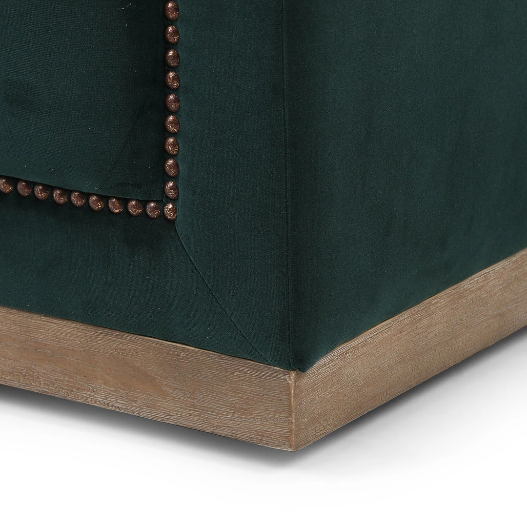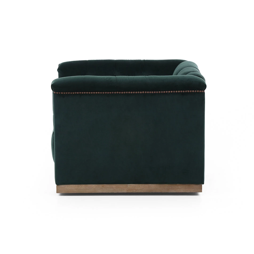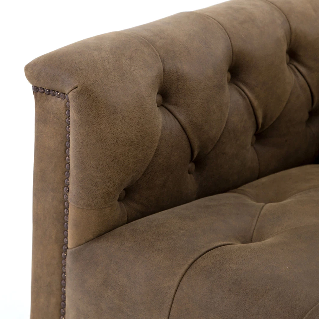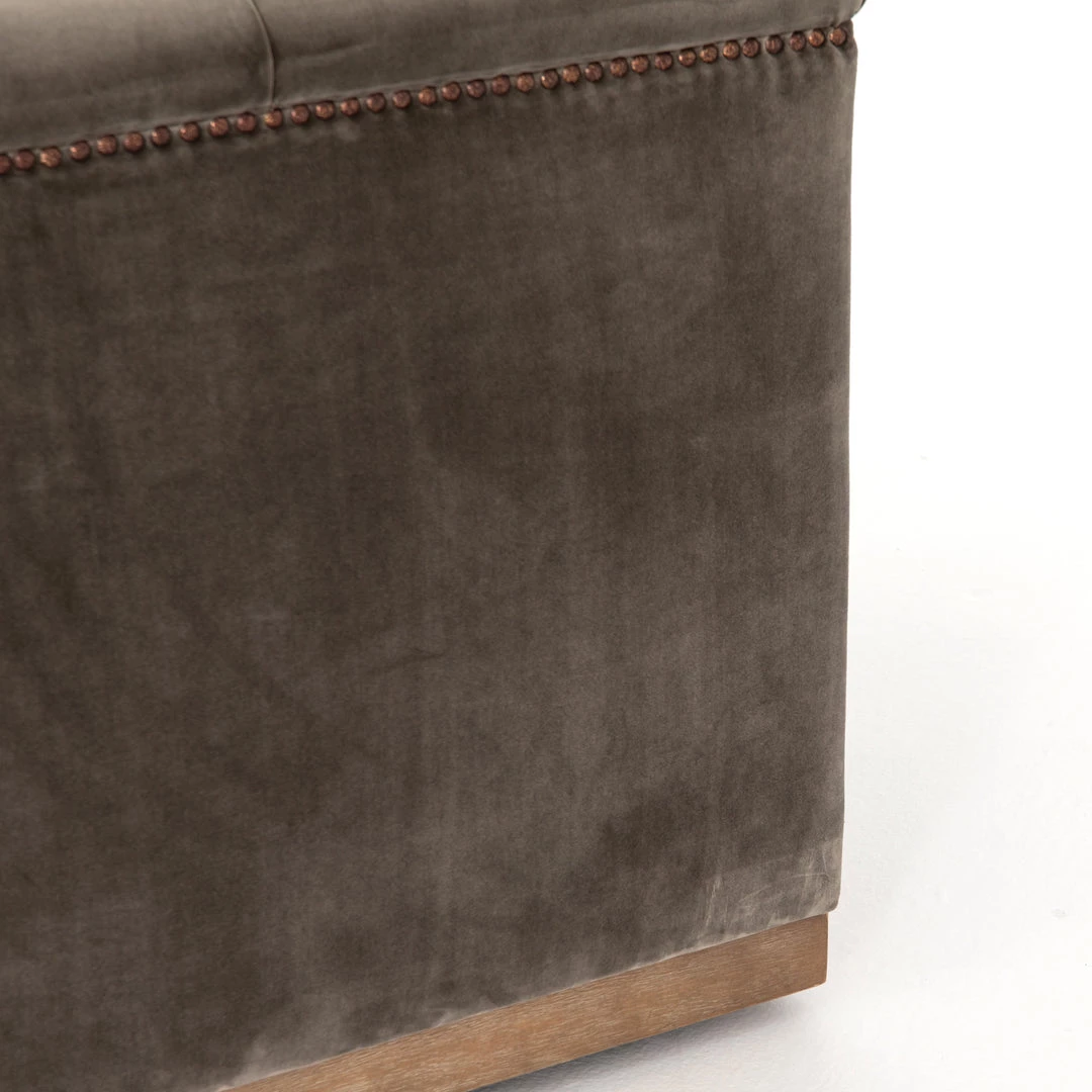 This modern take on the classic library chair is covered in soft grey polyester and mounted on a smooth swivel base of whitewashed parawood. Metal nailhead trim adds a pop of industrial contrast in aged bronze.