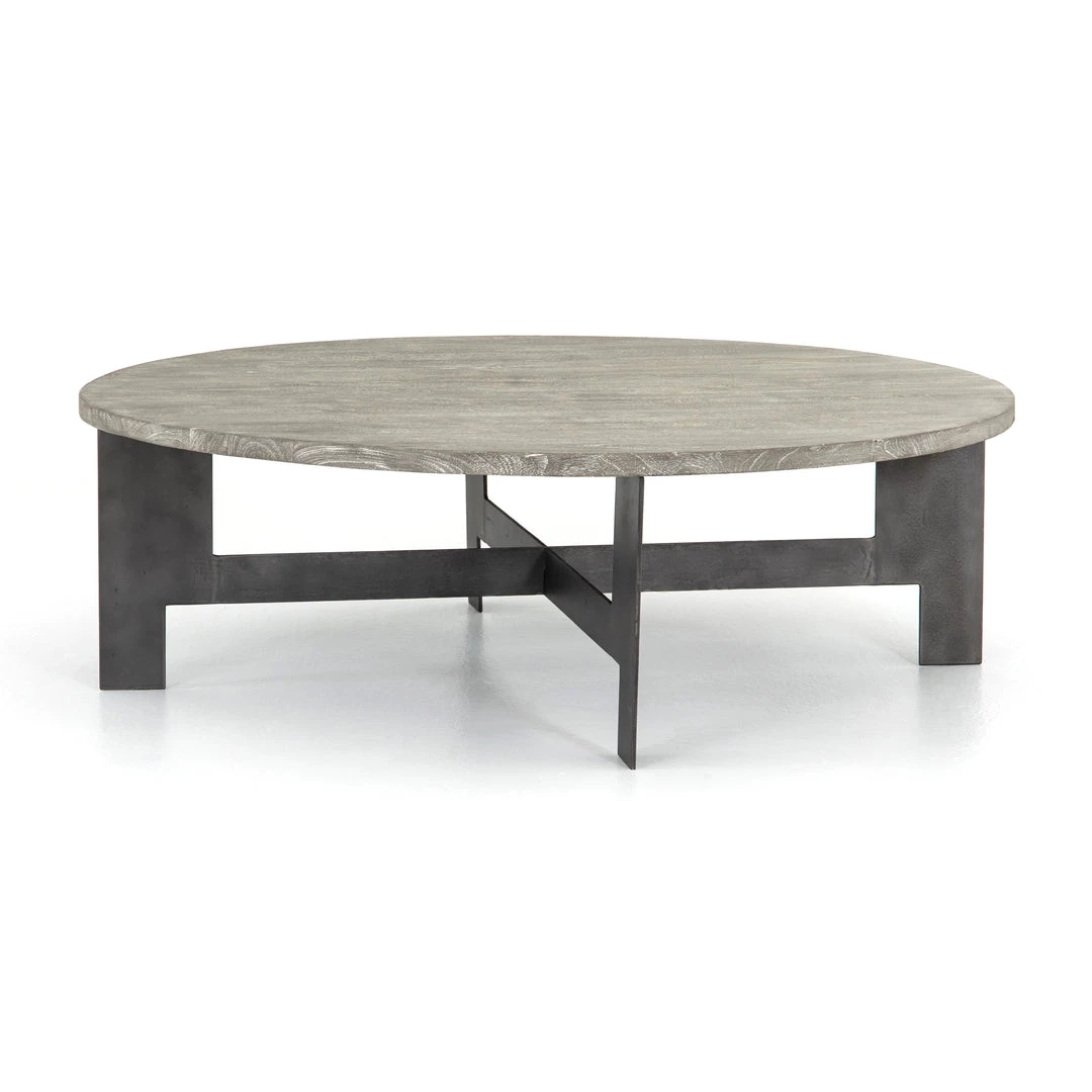 Cool neutrals combine in a thick charcoal top and slim, flat stock gunmetal base. Tone on tone finishes and X shaped stretchers add movement.