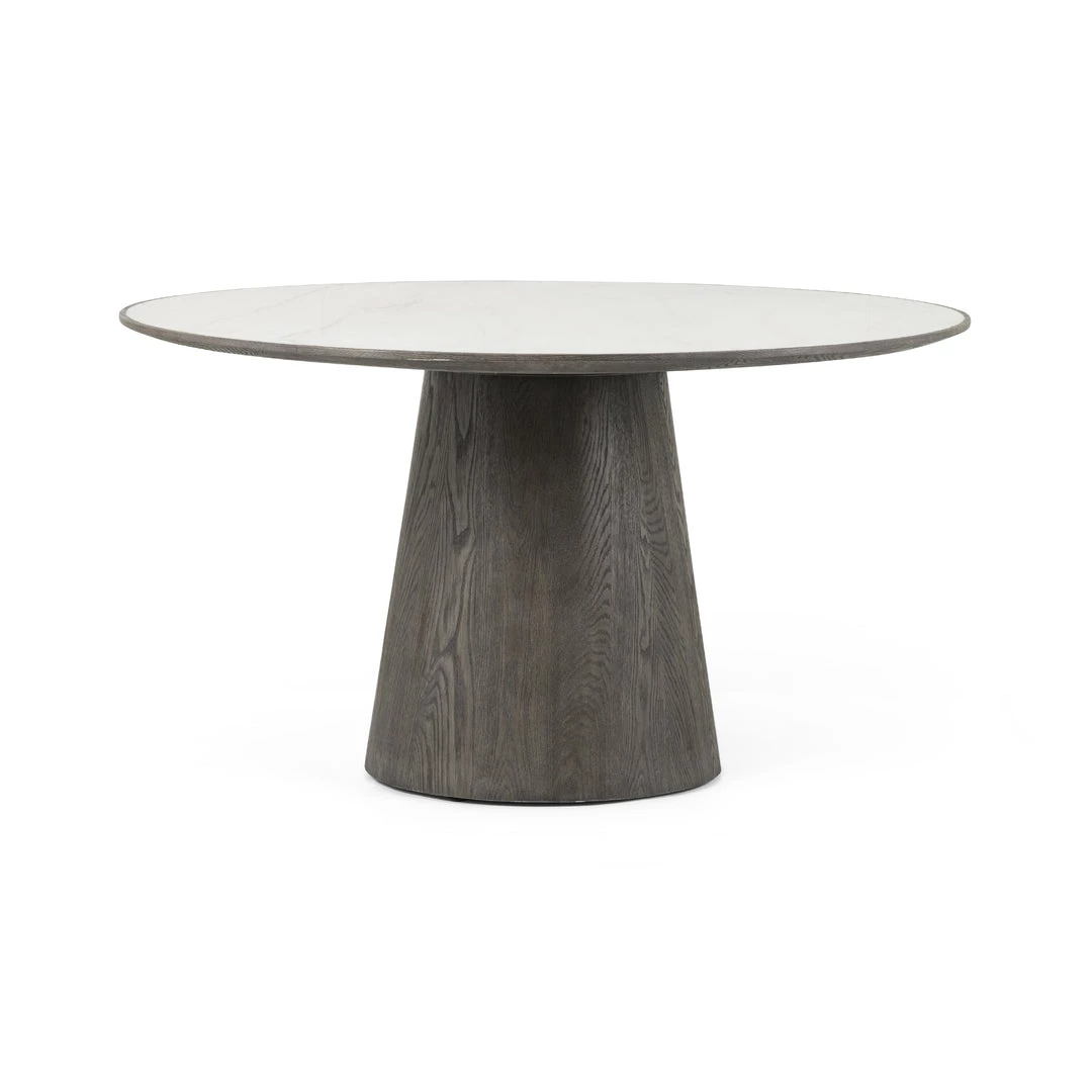 Mixed materials make for great drama. A cone-tapered base of dark, weathered oak supports a rounded tabletop of white-finished solid marble, with oak banding on the edges for thoughtful contrast.