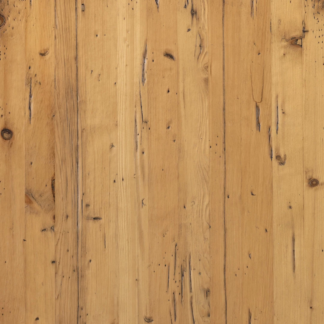 Solid reclaimed pine features visible weathering, playing up the natural beauty of this primitive French-inspired design.