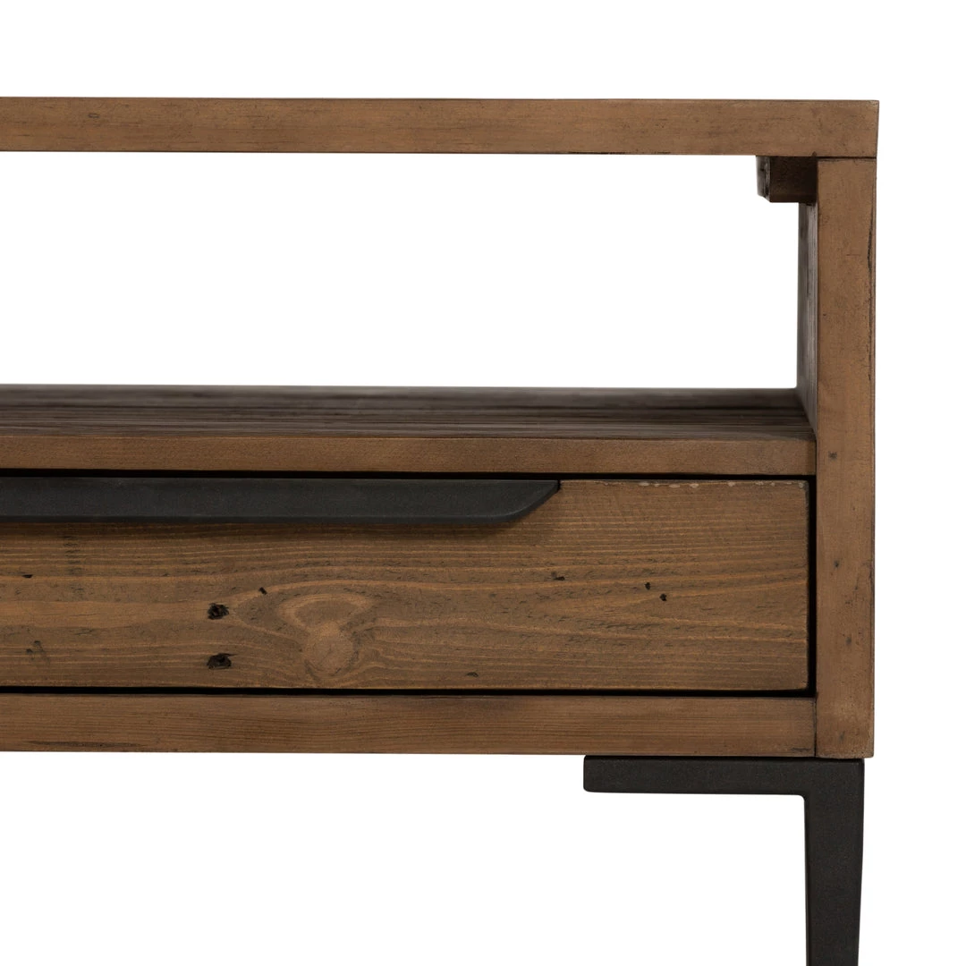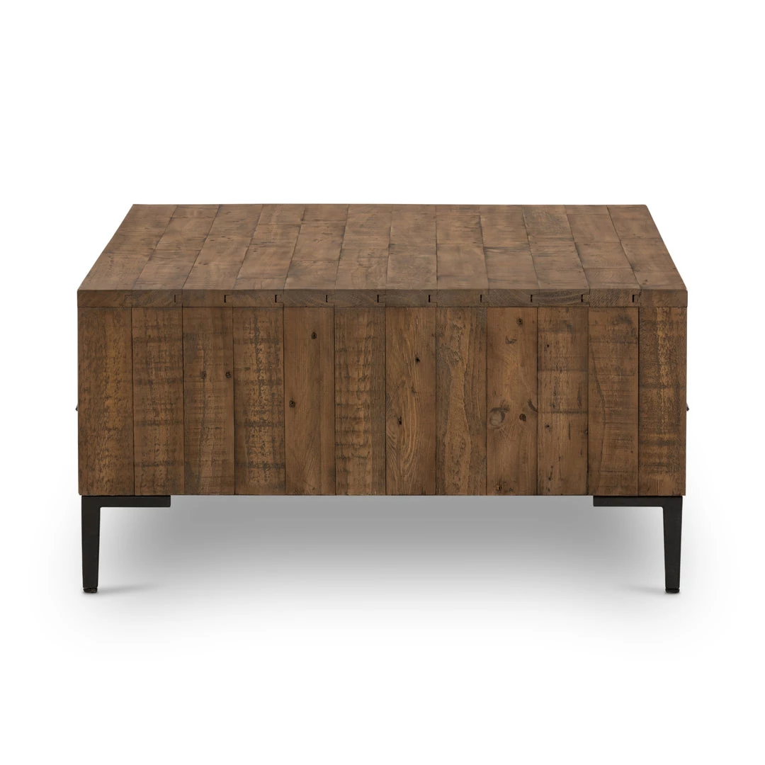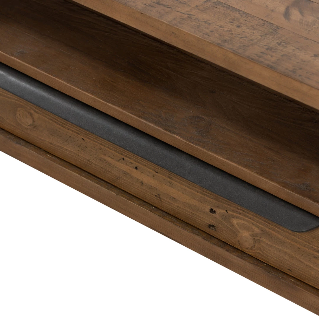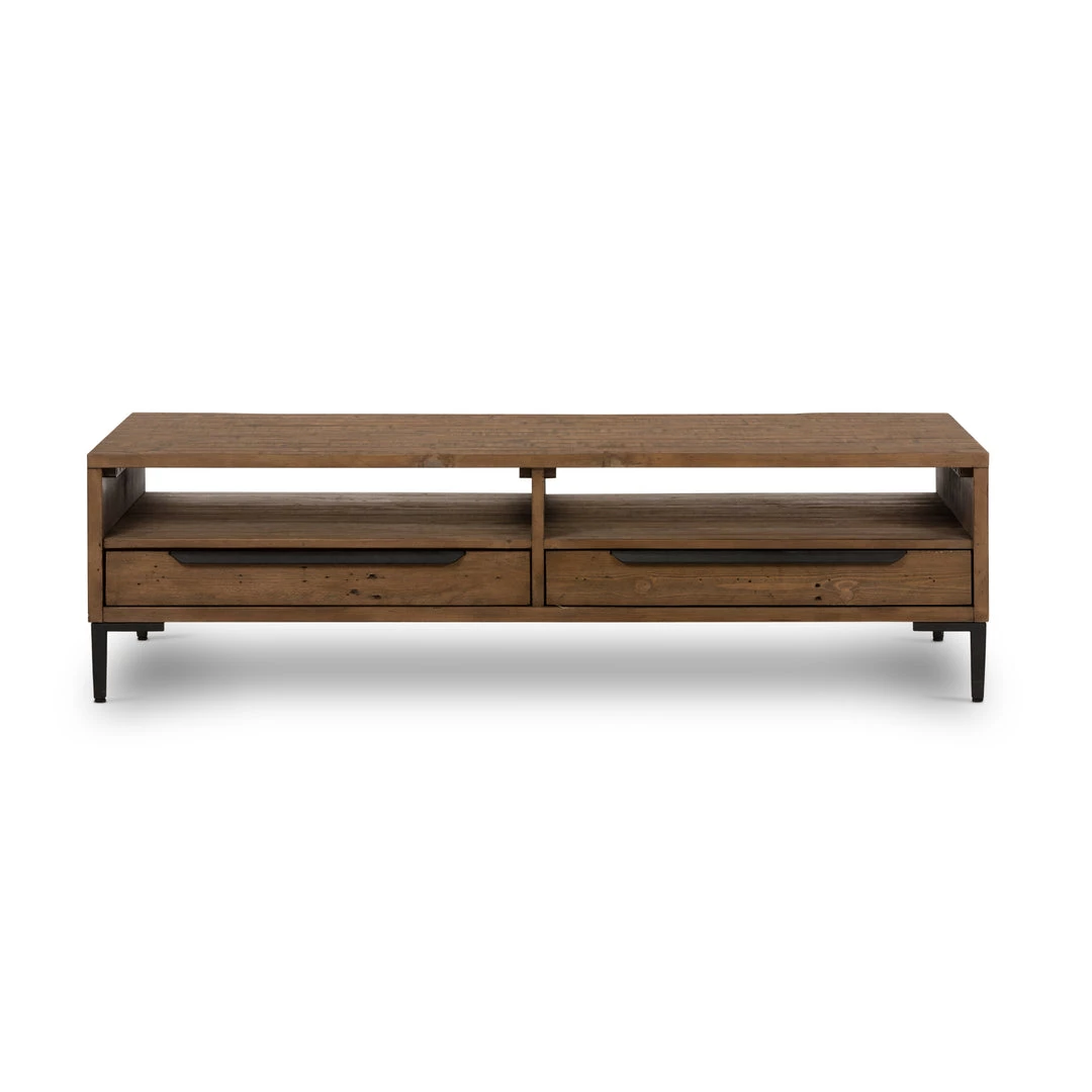 Finished in a rustic sandalwood, solid reclaimed pine flaunts its natural graining, while flat, gunmetal-finished iron hardware adds a touch of modernity to a low-styled coffee table. Four drawers and open cubbies bring extra storage space to the living room.